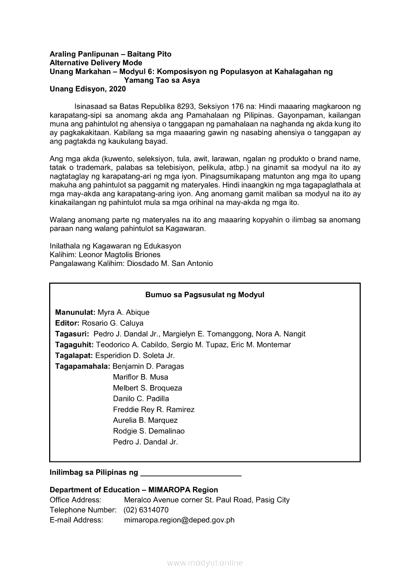 Araling Panlipunan 7 Modyul 6: Komposisyon ng Populasyon at Kahalagahan ng Yamang Tao sa AsyaApr 22, 2021 Grade 7Xiaomi Redmi Watch 5 Active 2inch LCD Display Clear Calling 5ATM Waterproof Smart Watch for only ₱3,999 ₱1,200!. Araling Panlipunan 7RelatedAraling Panlipunan Ikaapat na Markahan – Modyul 6: Nasyonalismo sa Silangan at Timog-Silangang AsyaAraling Panlipunan IKA-APAT na MARKAHAN – Modyul 3: NASYONALISMO sa SILANGAN at TIMOG-SILANGANG ASYAAraling Panlipunan Ikaapat na Markahan –Modyul 5: Mga Kababaihan ng Silangan at TimogSilangang AsyaAraling Panlipunan Ikaapat na Markahan – Modyul 2 Epekto ng Kolonyalismo at Imperyalismo sa Silangan at Timog-Silangang AsyaAraling Panlipunan Ikaapat na Markahan –Modyul 4: Karanasan, Implikasyon ng Digmaang Pandaigdig at Ugnayan ng Iba’t ibang Ideolohiya sa Pag-usbong ng Nasyonalismo sa mga Bansa sa Silangan at Timog- Silangang Asya