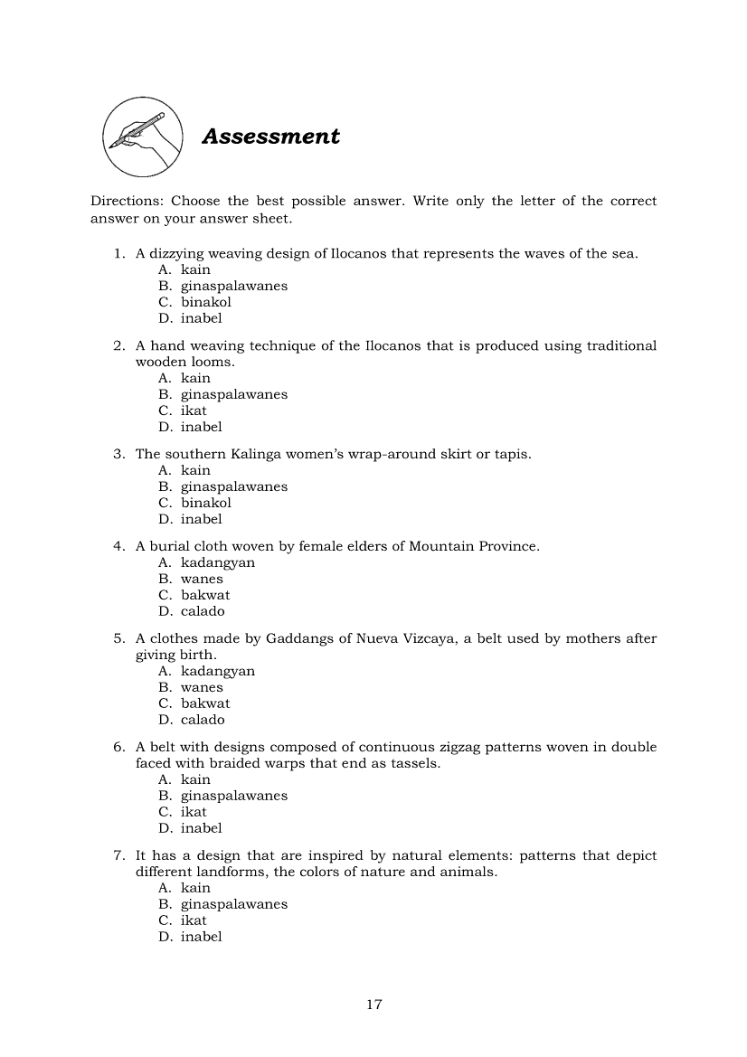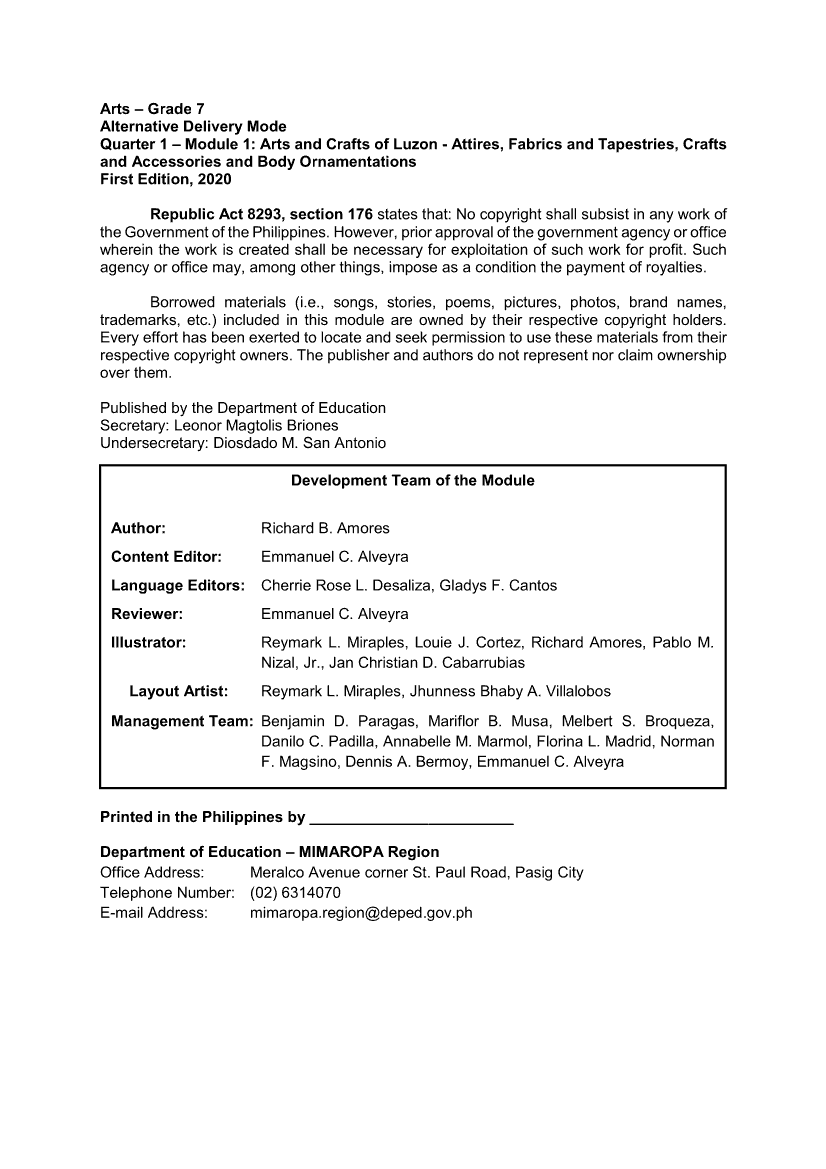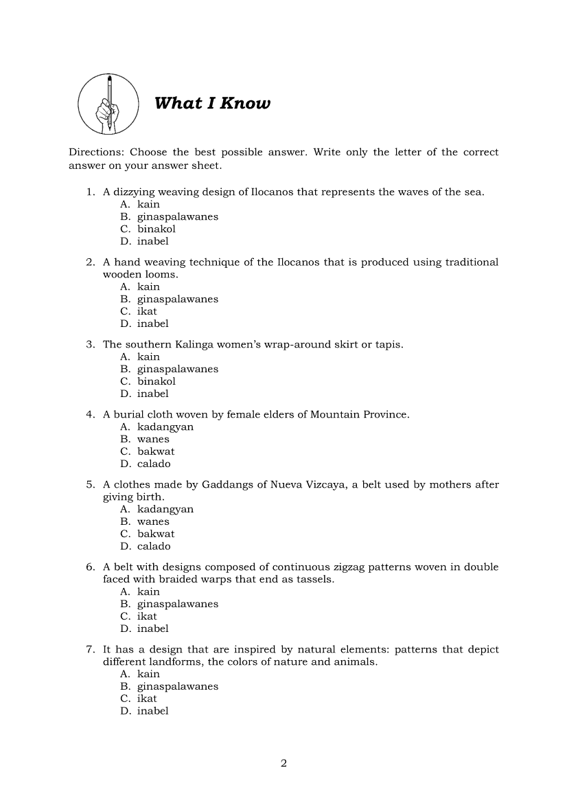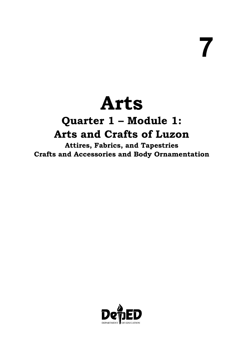 Arts 7 Module 1: Arts and Crafts of Luzon Attires, Fabrics, and Tapestries Crafts and Accessories and Body OrnamentationApr 22, 2021 Grade 7Xiaomi Redmi Watch 5 Active 2inch LCD Display Clear Calling 5ATM Waterproof Smart Watch for only ₱3,999 ₱1,200!. Arts 7RelatedARTS Quarter 4 – Module: 4b Representative Philippine Theatrical FormsARTS Quarter 4 – Module: 4a Religious and Non-Religious FestivalsArts 7 Module 5: Arts and Crafts of Luzon (Highlands and Lowlands) Attire, Fabrics, and TapestriesArts 7 Second Quarter Module (PIVOT)Arts 7 Module 3: Arts and Crafts of MIMAROPA and the Visayas When Bisaya Meets Tagalog Elements of Art