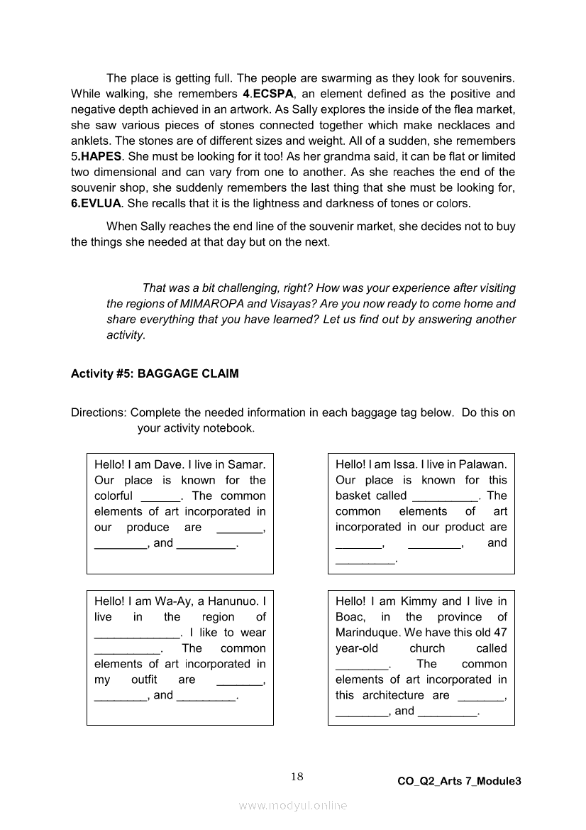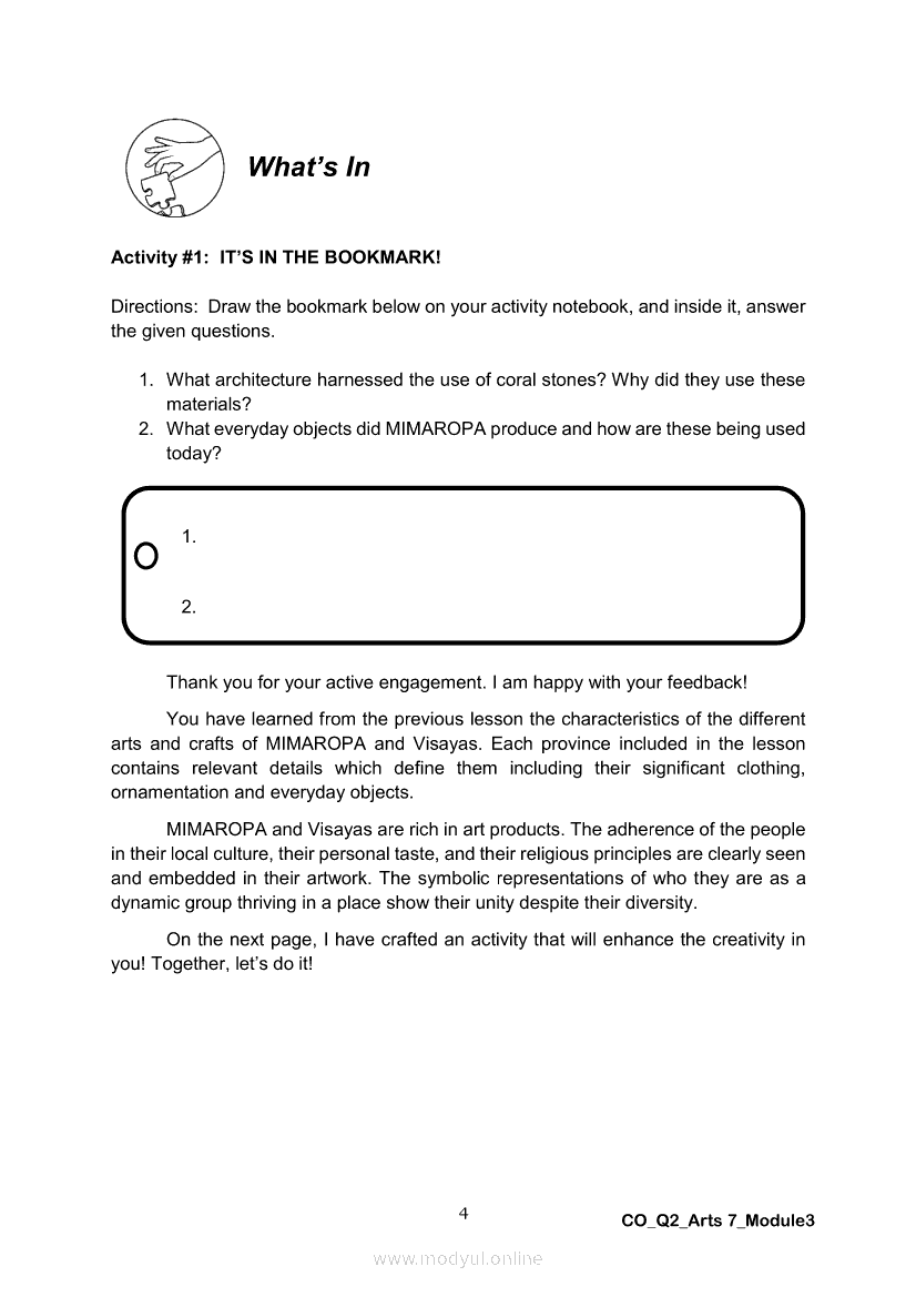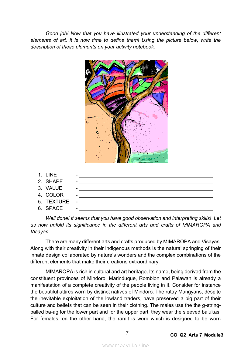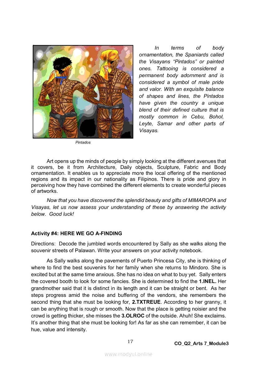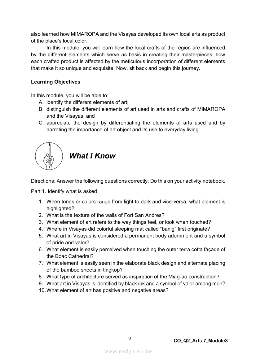 Arts 7 Module 3: Arts and Crafts of MIMAROPA and the Visayas When Bisaya Meets Tagalog Elements of ArtApr 22, 2021 Grade 7Xiaomi Redmi Watch 5 Active 2inch LCD Display Clear Calling 5ATM Waterproof Smart Watch for only ₱3,999 ₱1,200!. Arts 7RelatedARTS Quarter 4 – Module: 4a Religious and Non-Religious FestivalsARTS Quarter 4 – Module: 4b Representative Philippine Theatrical FormsArts 7 Second Quarter Module (PIVOT)Arts 7 Module 5: Arts and Crafts of Luzon (Highlands and Lowlands) Attire, Fabrics, and TapestriesArts 7 Module 8: Creation of Arts and Crafts of Luzon (Highlands and Lowlands) Sculpture