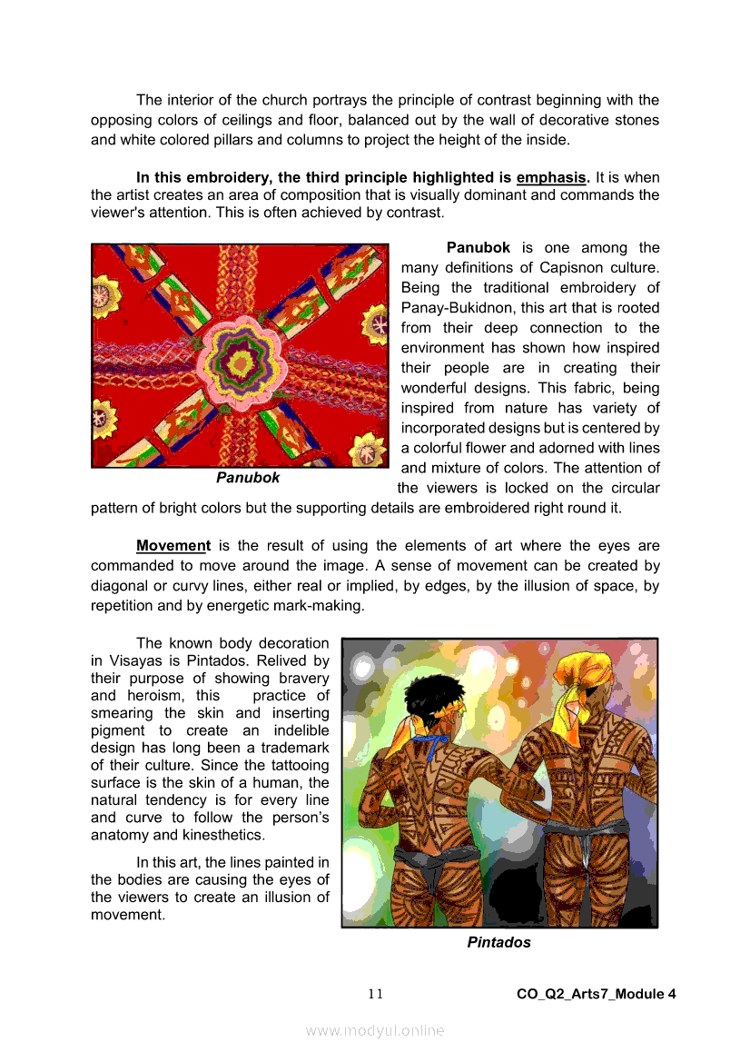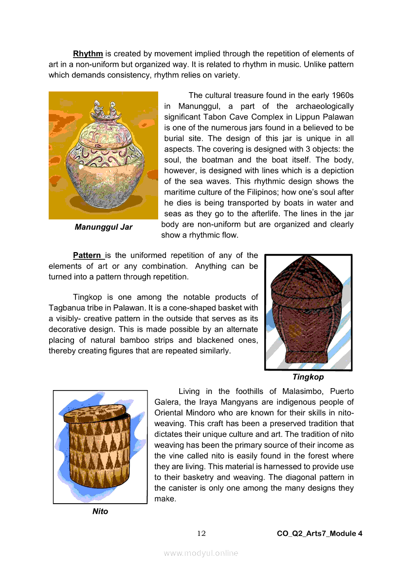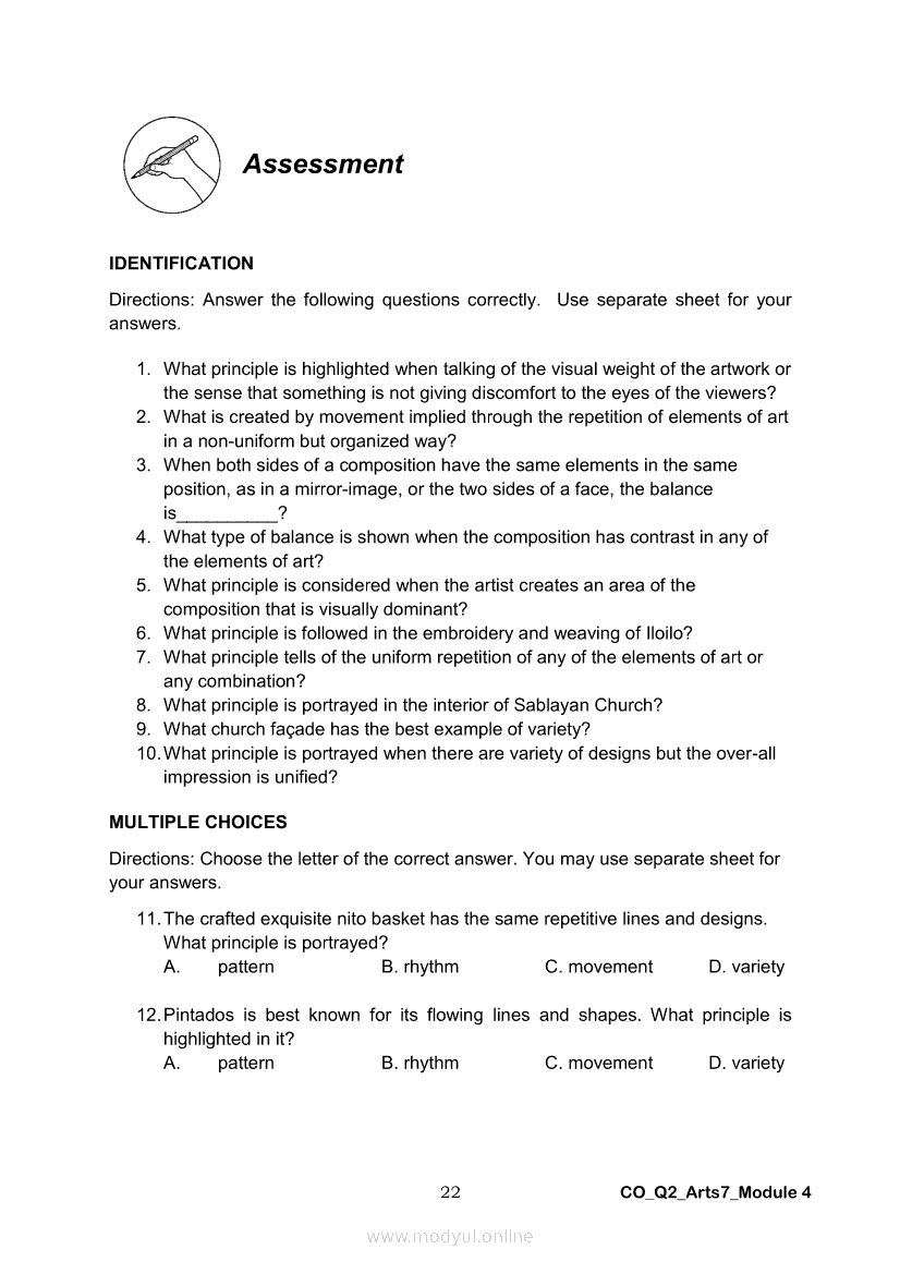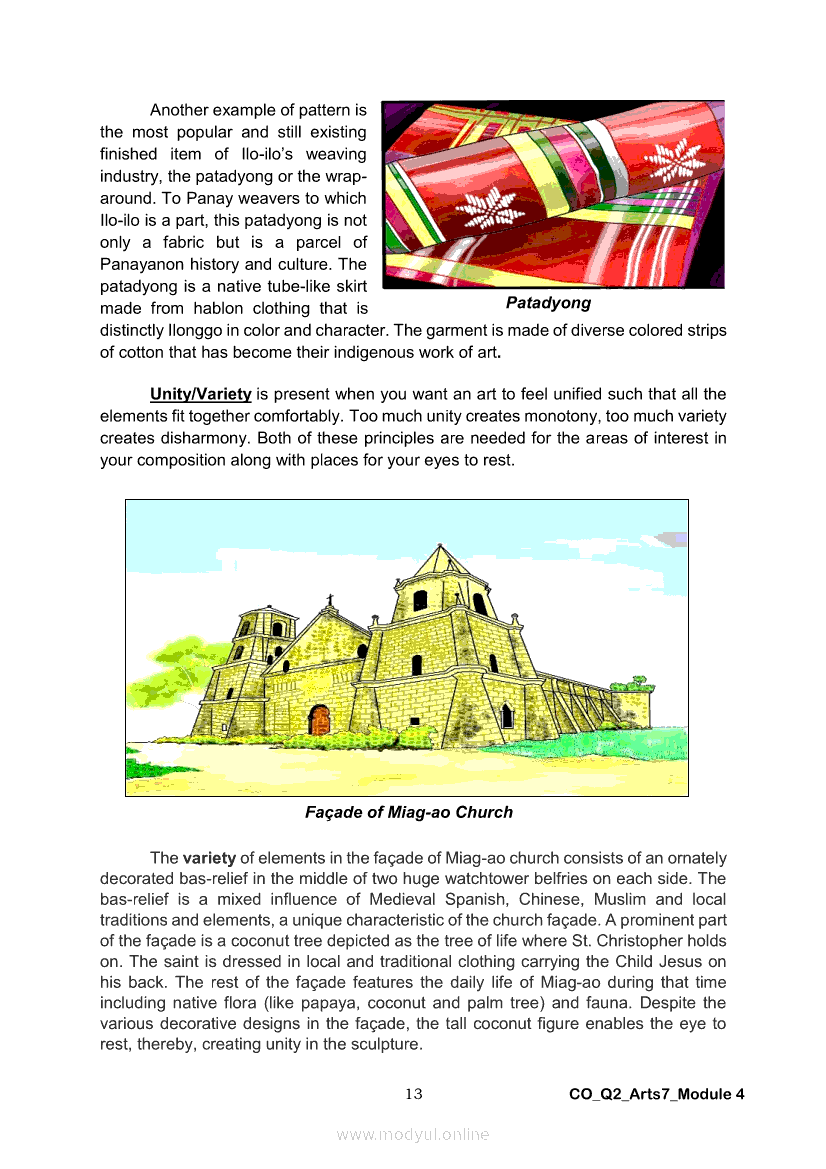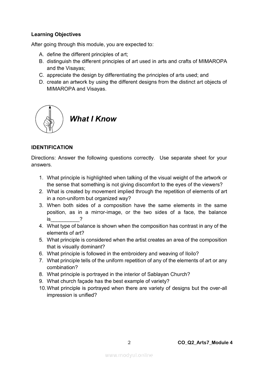 Arts 7 Module 4: Arts and Crafts of MIMAROPA and the Visayas - Principles behind the Elements (Principles of Arts)Apr 22, 2021 Grade 7Xiaomi Redmi Watch 5 Active 2inch LCD Display Clear Calling 5ATM Waterproof Smart Watch for only ₱3,999 ₱1,200!. Arts 7RelatedARTS Quarter 4 – Module: 4a Religious and Non-Religious FestivalsARTS Quarter 4 – Module: 4b Representative Philippine Theatrical FormsArts 7 Module 3: Arts and Crafts of MIMAROPA and the Visayas When Bisaya Meets Tagalog Elements of ArtArts 7 Module 1: Arts and Crafts of Luzon Attires, Fabrics, and Tapestries Crafts and Accessories and Body OrnamentationArts 7 Module 5: Arts and Crafts of Luzon (Highlands and Lowlands) Attire, Fabrics, and Tapestries