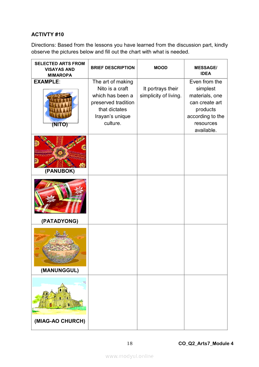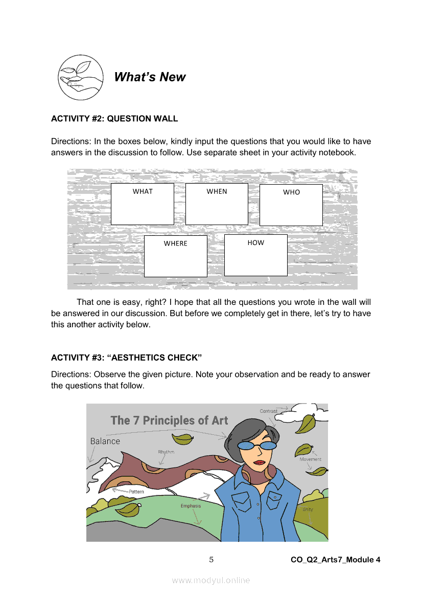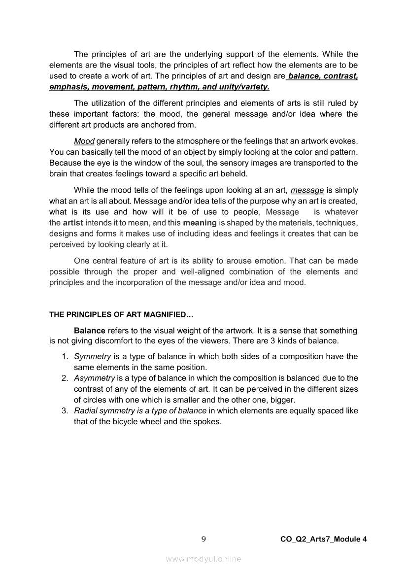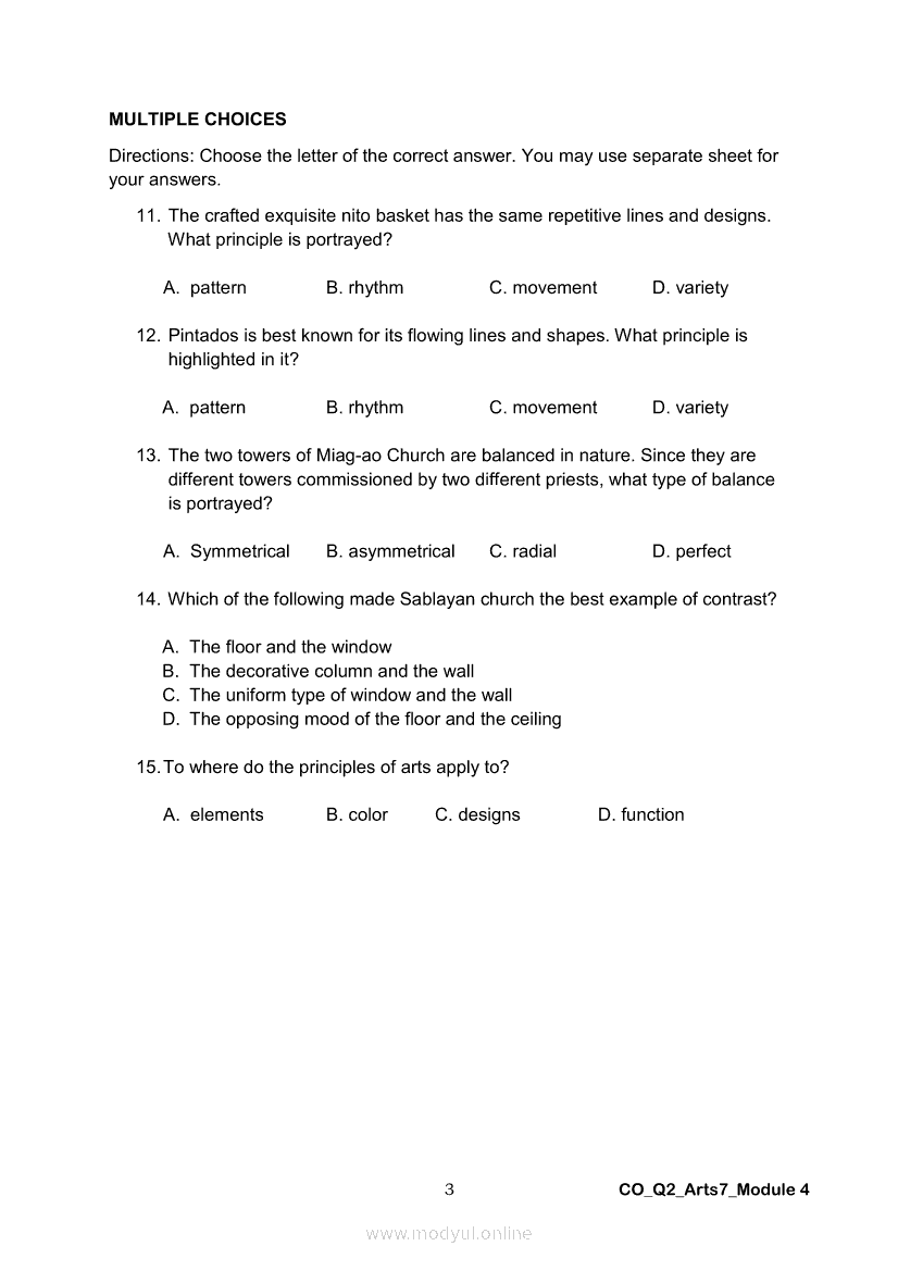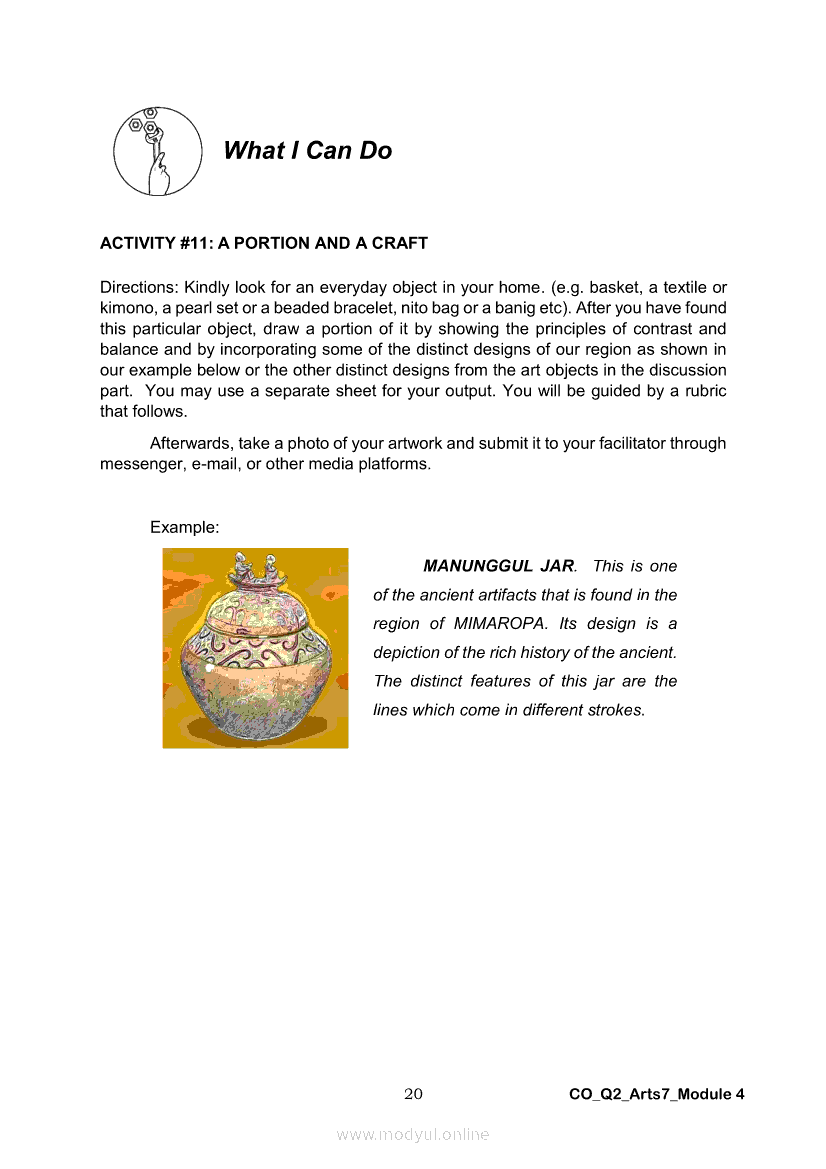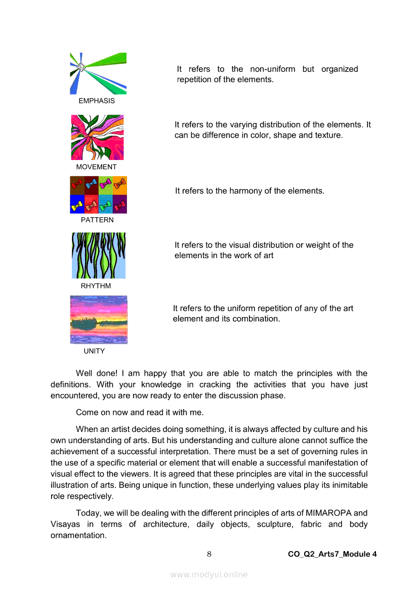 Arts 7 Module 4: Arts and Crafts of MIMAROPA and the Visayas - Principles behind the Elements (Principles of Arts)Apr 22, 2021 Grade 7Xiaomi Redmi Watch 5 Active 2inch LCD Display Clear Calling 5ATM Waterproof Smart Watch for only ₱3,999 ₱1,200!. Arts 7RelatedARTS Quarter 4 – Module: 4a Religious and Non-Religious FestivalsARTS Quarter 4 – Module: 4b Representative Philippine Theatrical FormsArts 7 Module 3: Arts and Crafts of MIMAROPA and the Visayas When Bisaya Meets Tagalog Elements of ArtArts 7 Module 1: Arts and Crafts of Luzon Attires, Fabrics, and Tapestries Crafts and Accessories and Body OrnamentationArts 7 Module 5: Arts and Crafts of Luzon (Highlands and Lowlands) Attire, Fabrics, and Tapestries