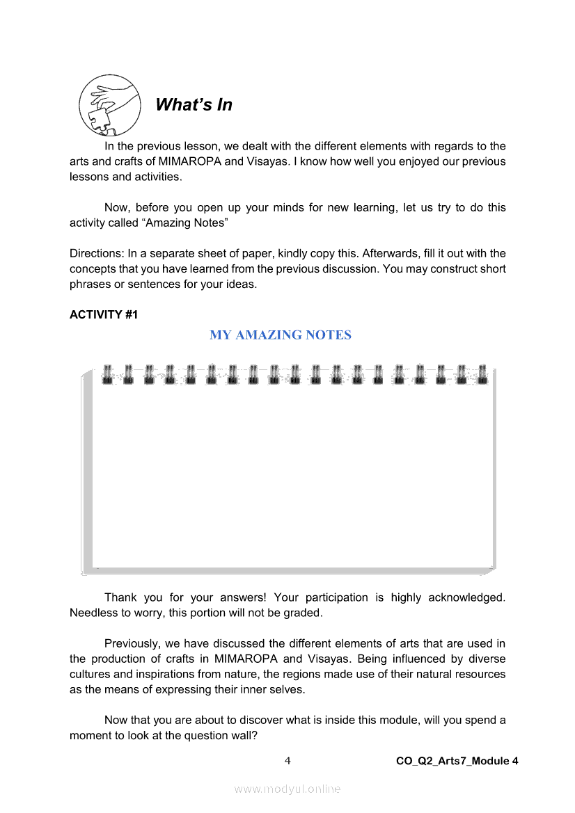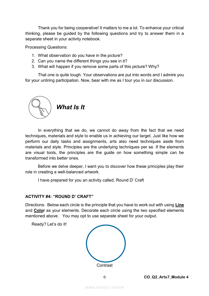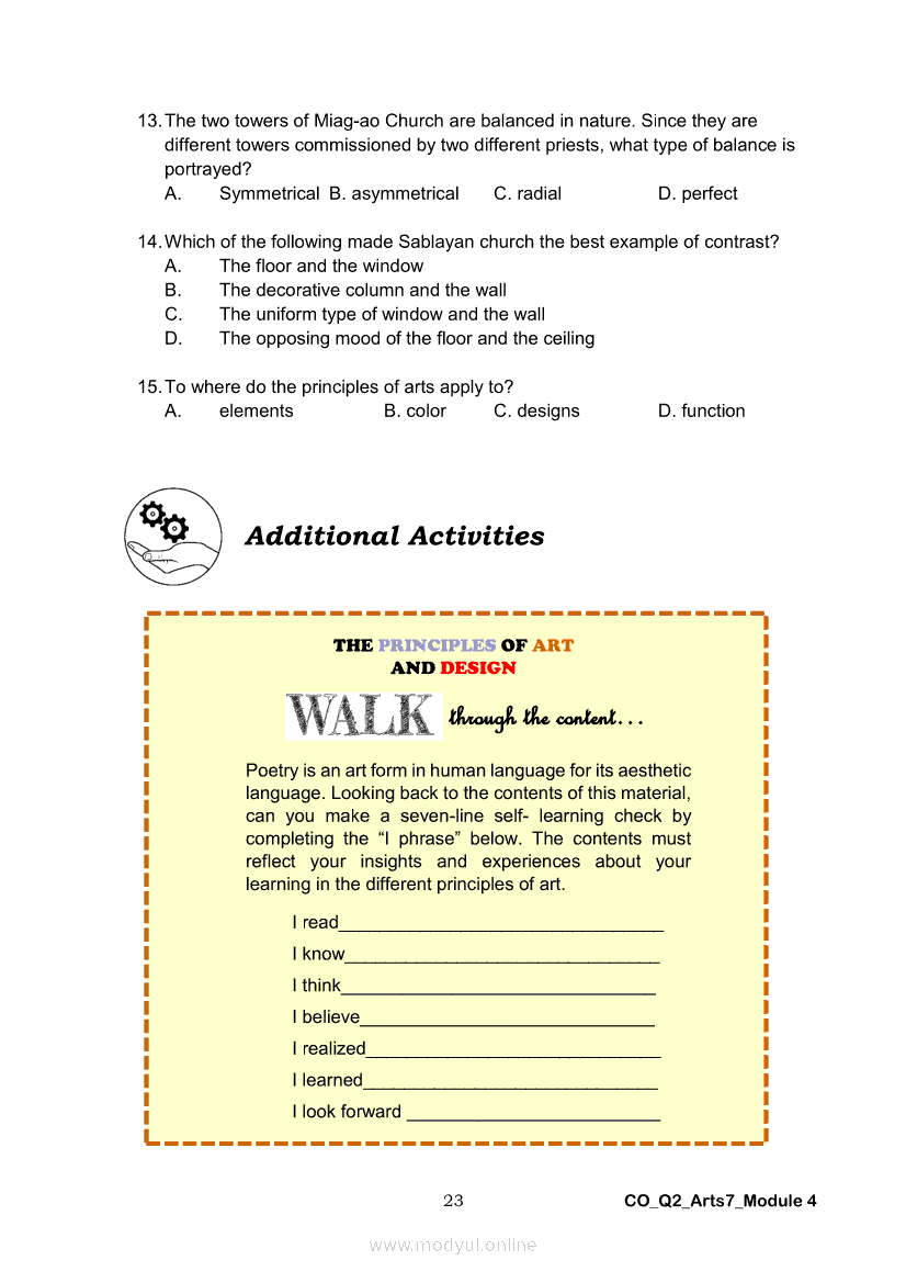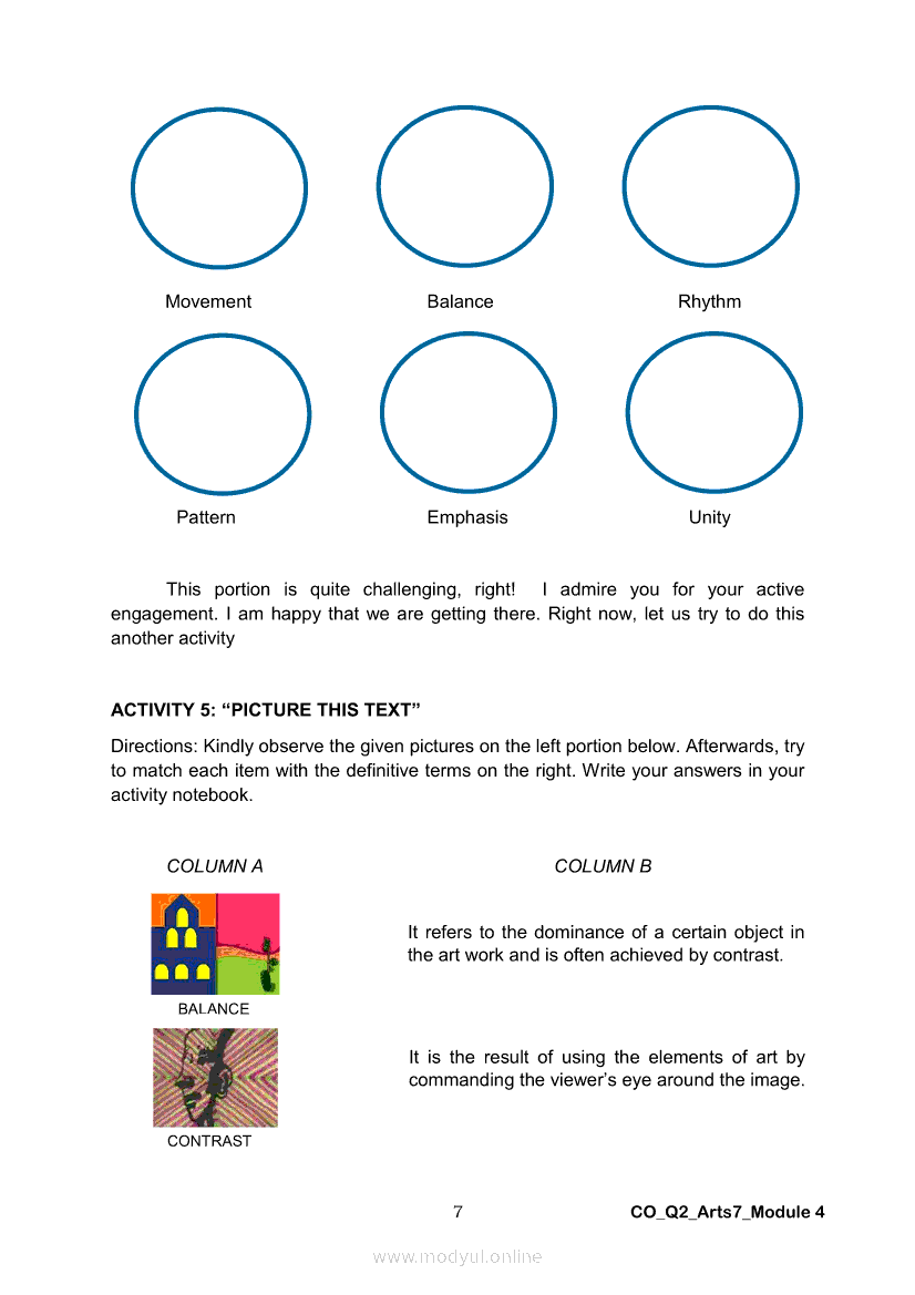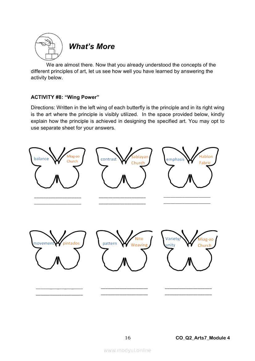 Arts 7 Module 4: Arts and Crafts of MIMAROPA and the Visayas - Principles behind the Elements (Principles of Arts)Apr 22, 2021 Grade 7Xiaomi Redmi Watch 5 Active 2inch LCD Display Clear Calling 5ATM Waterproof Smart Watch for only ₱3,999 ₱1,200!. Arts 7RelatedARTS Quarter 4 – Module: 4a Religious and Non-Religious FestivalsARTS Quarter 4 – Module: 4b Representative Philippine Theatrical FormsArts 7 Module 3: Arts and Crafts of MIMAROPA and the Visayas When Bisaya Meets Tagalog Elements of ArtArts 7 Module 1: Arts and Crafts of Luzon Attires, Fabrics, and Tapestries Crafts and Accessories and Body OrnamentationArts 7 Module 5: Arts and Crafts of Luzon (Highlands and Lowlands) Attire, Fabrics, and Tapestries