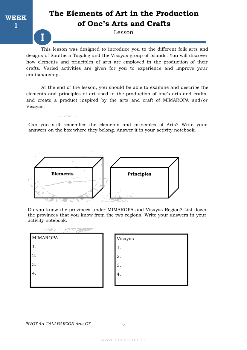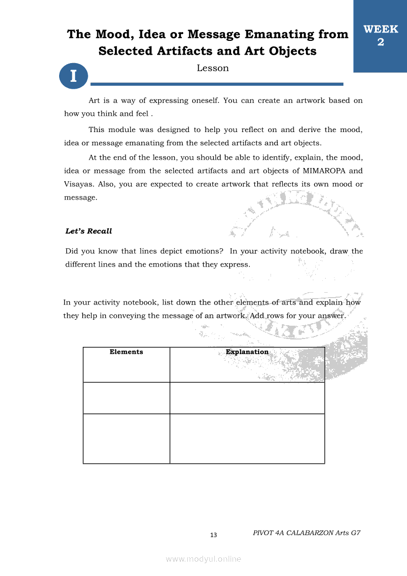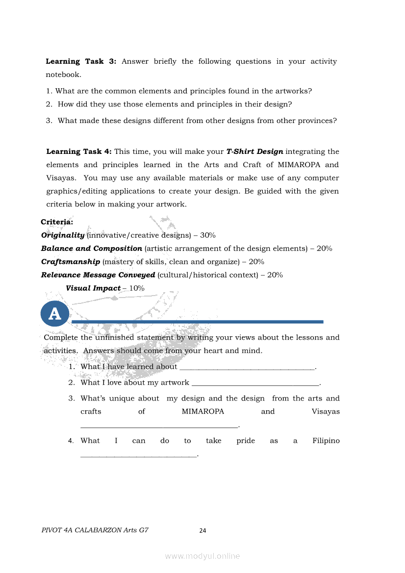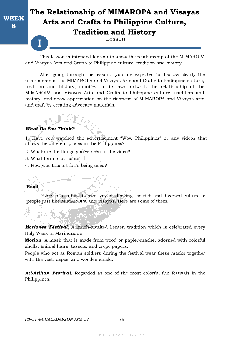 Arts 7 Second Quarter Module (PIVOT)Apr 22, 2021 Grade 7Xiaomi Redmi Watch 5 Active 2inch LCD Display Clear Calling 5ATM Waterproof Smart Watch for only ₱3,999 ₱1,200!. Arts 7RelatedARTS Quarter 4 – Module: 4a Religious and Non-Religious FestivalsARTS Quarter 4 – Module: 4b Representative Philippine Theatrical FormsArts 7 Module 3: Arts and Crafts of MIMAROPA and the Visayas When Bisaya Meets Tagalog Elements of ArtArts 7 Module 3: Arts and Crafts of Luzon Elements of Beauty and UniquenessArts 7 Module 1: Arts and Crafts of Luzon Attires, Fabrics, and Tapestries Crafts and Accessories and Body Ornamentation