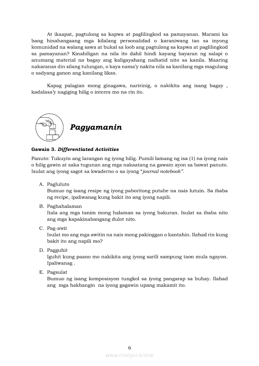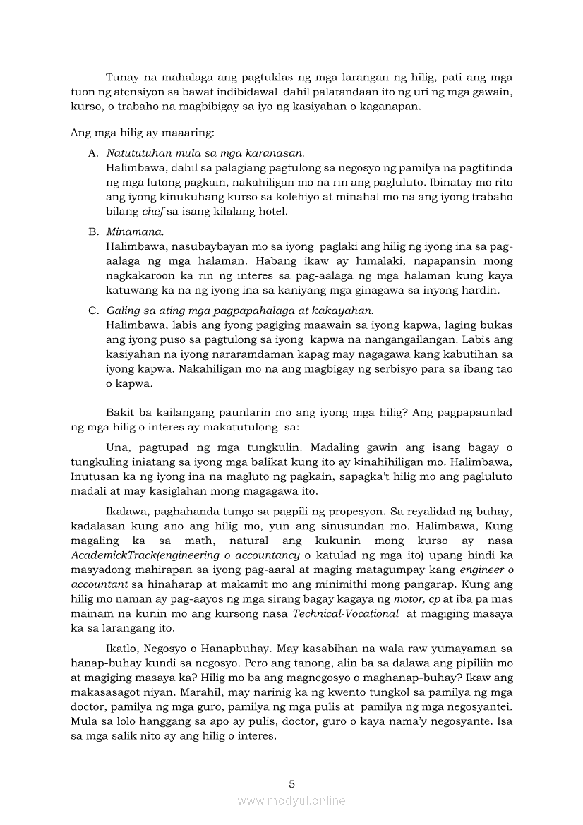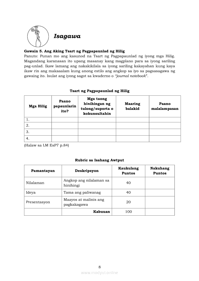 Edukasyon sa Pagpapakatao 7 Modyul 8: Pag-unlad ng Hilig Paglawak ng TungkulinApr 22, 2021 Grade 7Xiaomi Redmi Watch 5 Active 2inch LCD Display Clear Calling 5ATM Waterproof Smart Watch for only ₱3,999 ₱1,200!. Edukasyon sa Pagpapakatao 7RelatedEdukasyon sa Pagpapakatao Ikaapat na Markahan – Modyul 12.a: Ang Kahalagahan ng Mabuting Pagpapasya sa Uri ng Buhay (Linggo: Una)Edukasyon sa Pagpapakatao Ikaapat Markahan – Modyul: 12.b Ang Pahayag ng Personal na Layunin sa Buhay o Personal Mission Statement (Linggo:Ikalawa)Edukasyon sa Pagpapakatao 7 Modyul 5: Tiwala sa Sarili Ating BuuinEdukasyon sa Pagpapakatao 7 Modyul 3: Pagpapaunlad ng Tiwala sa SariliEdukasyon sa Pagpapakatao 7 Modyul 7: Hilig Ayon sa Larangan at Tuon