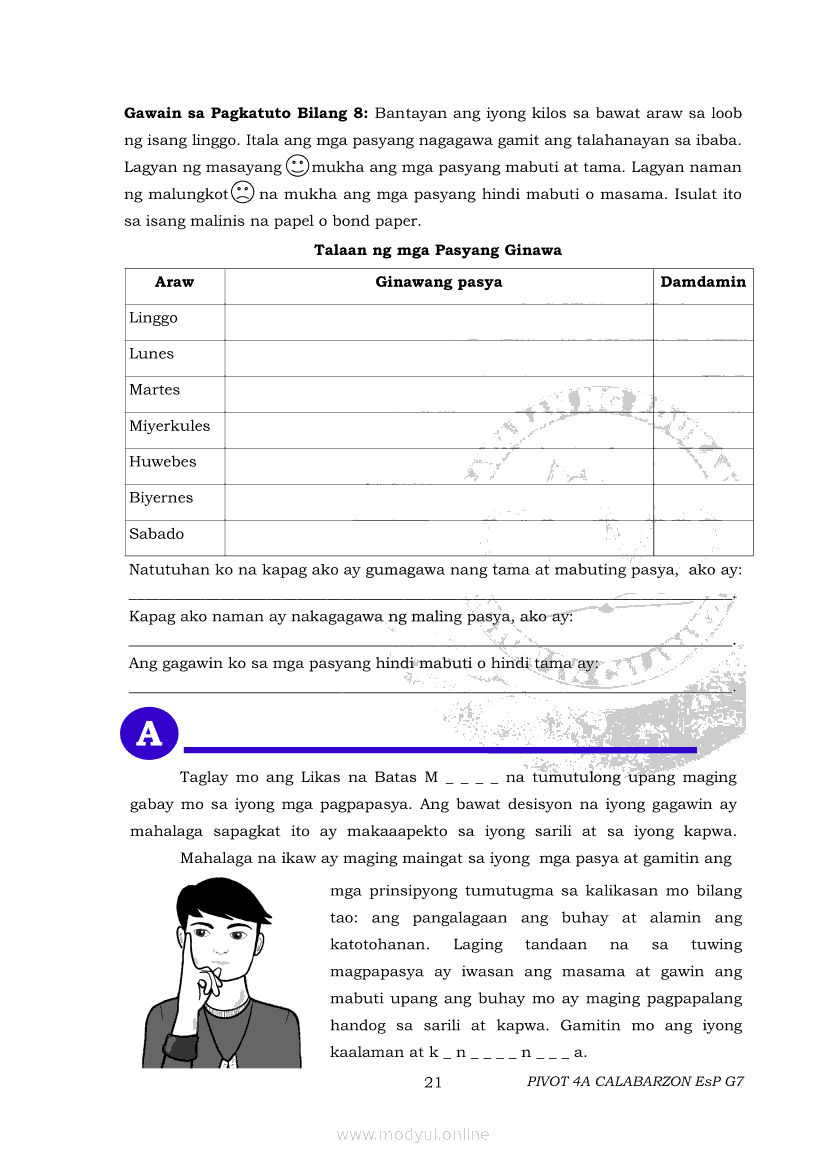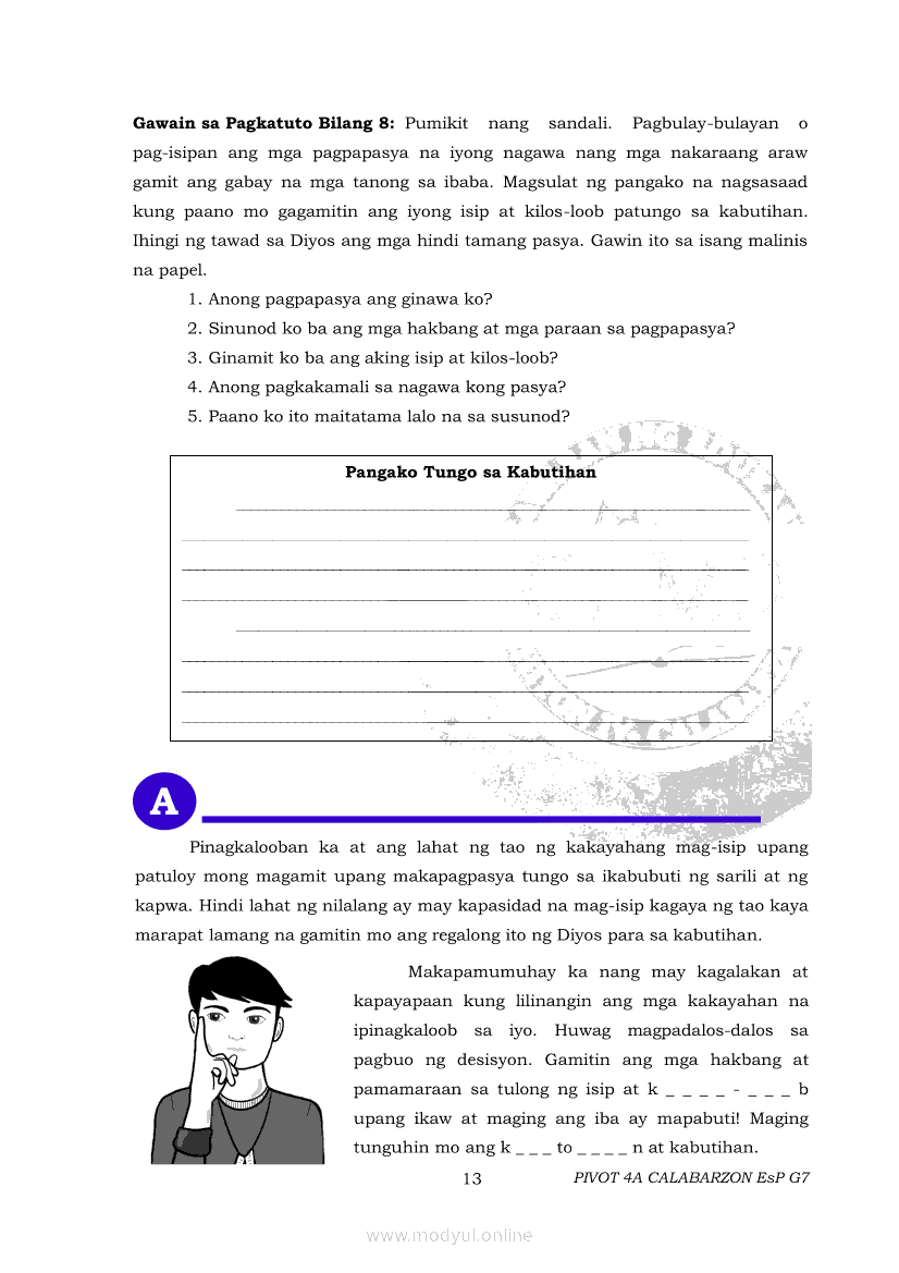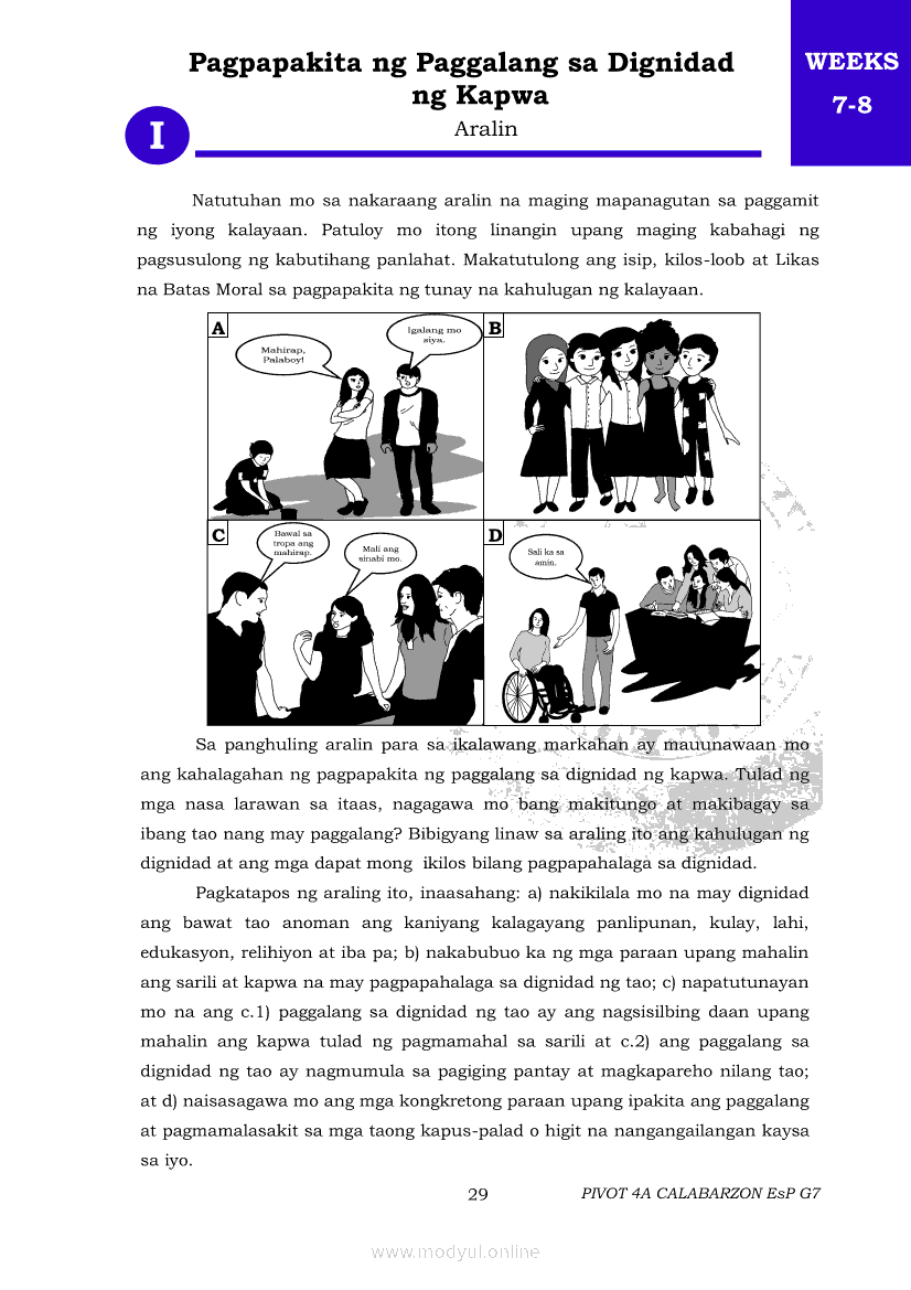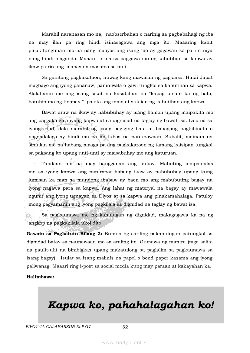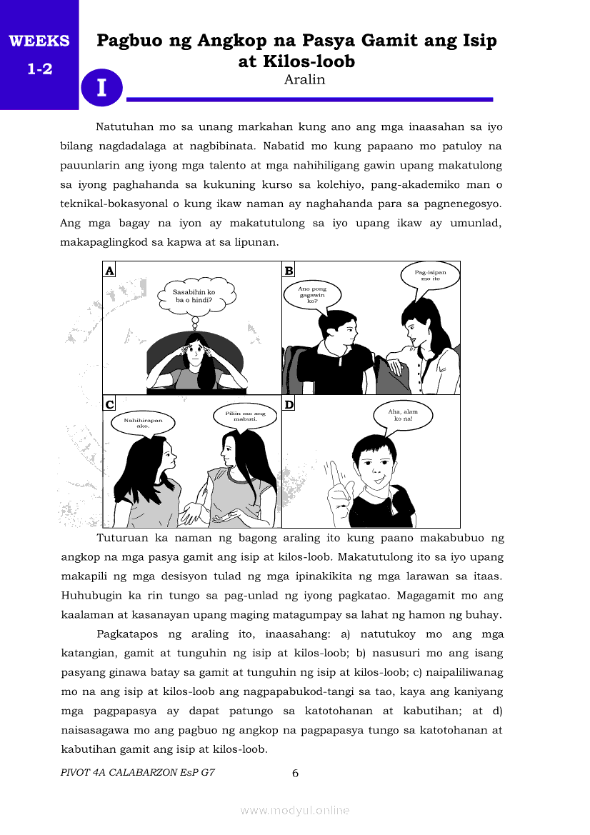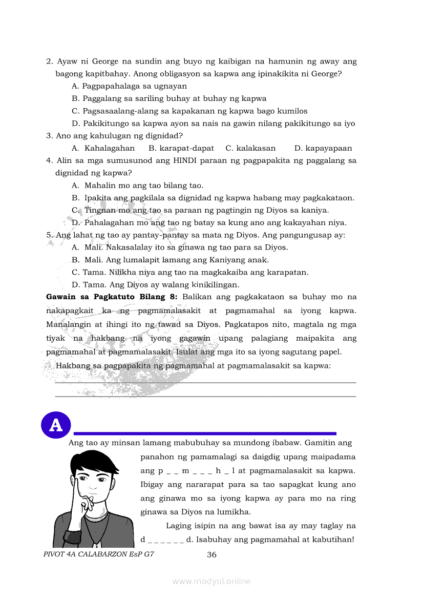 Edukasyon sa Pagpapakatao 7 Modyul para sa Ikalawang Markahan (PIVOT)Apr 22, 2021 Grade 7Xiaomi Redmi Watch 5 Active 2inch LCD Display Clear Calling 5ATM Waterproof Smart Watch for only ₱3,999 ₱1,200!. Edukasyon sa Pagpapakatao 7RelatedEdukasyon sa Pagpapakatao Ikaapat Markahan – Modyul: 12.b Ang Pahayag ng Personal na Layunin sa Buhay o Personal Mission Statement (Linggo:Ikalawa)Edukasyon sa Pagpapakatao Ikaapat na Markahan – Modyul 12.a: Ang Kahalagahan ng Mabuting Pagpapasya sa Uri ng Buhay (Linggo: Una)Edukasyon sa Pagpapakatao 7 Modyul 1: Ako NgayonEdukasyon sa Pagpapakatao 7 Modyul 8: Pag-unlad ng Hilig Paglawak ng TungkulinEdukasyon sa Pagpapakatao 7 Modyul 4: Talento Mo, Ating Tuklasin