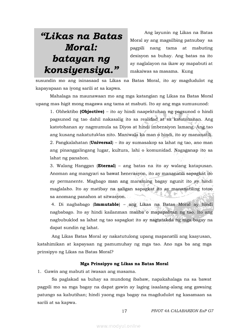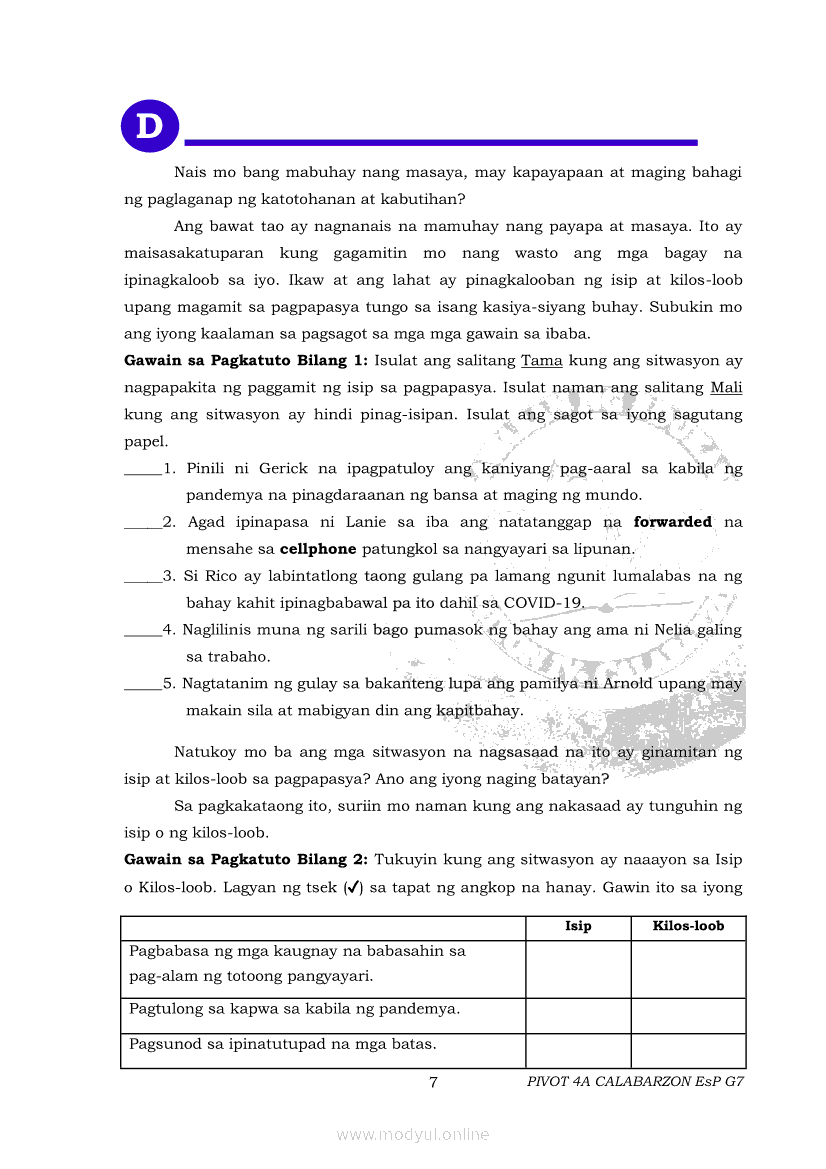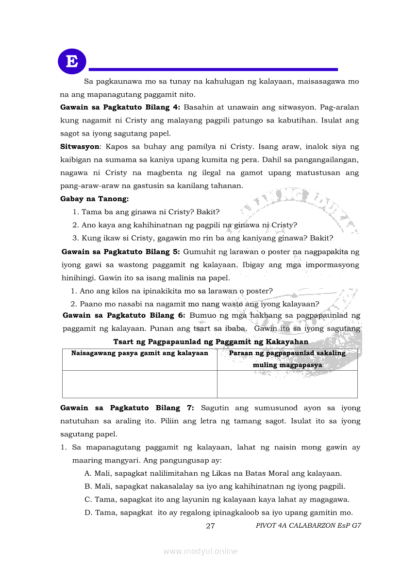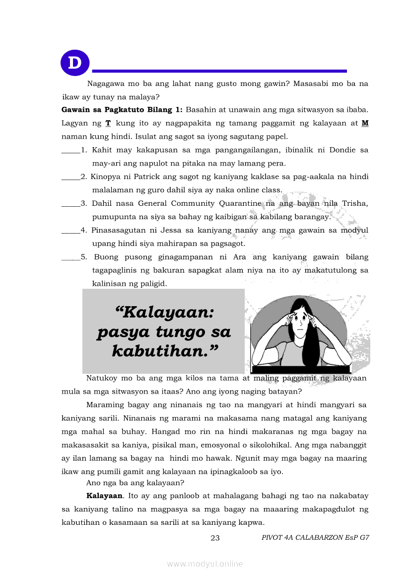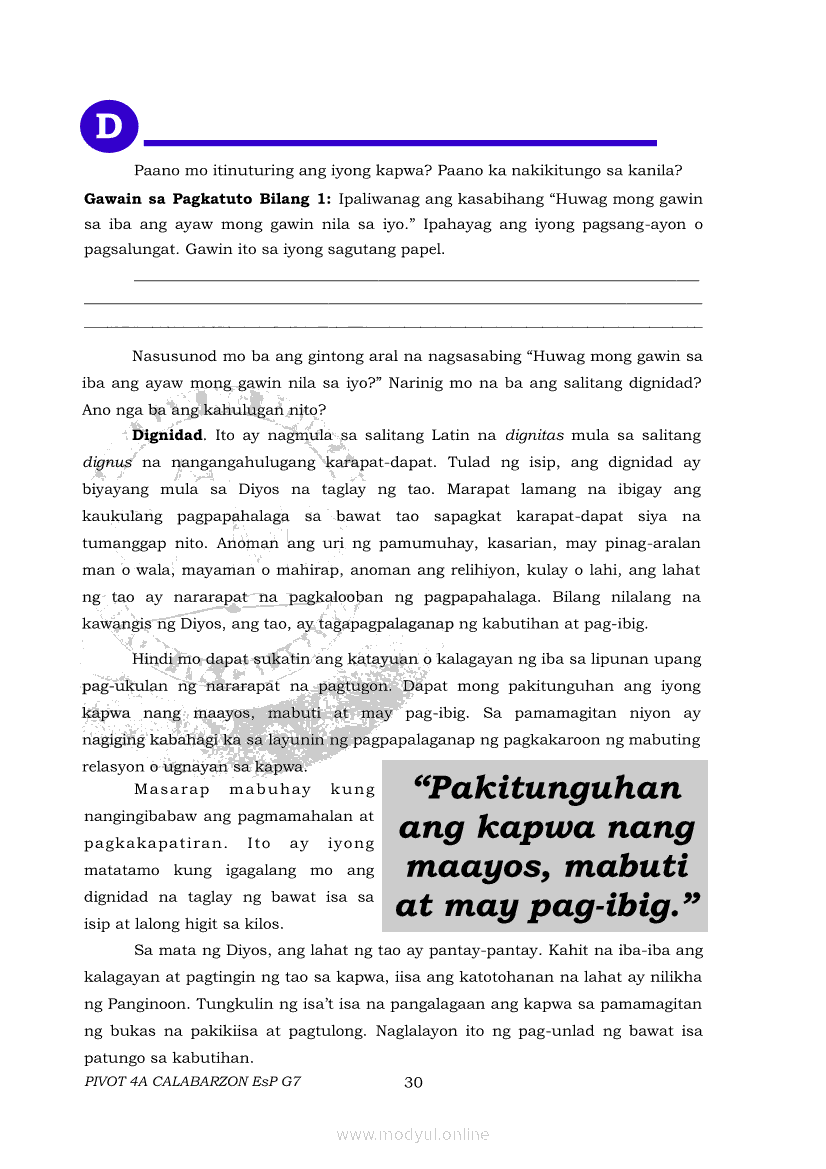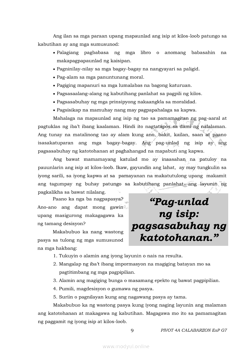 Edukasyon sa Pagpapakatao 7 Modyul para sa Ikalawang Markahan (PIVOT)Apr 22, 2021 Grade 7Xiaomi Redmi Watch 5 Active 2inch LCD Display Clear Calling 5ATM Waterproof Smart Watch for only ₱3,999 ₱1,200!. Edukasyon sa Pagpapakatao 7RelatedEdukasyon sa Pagpapakatao Ikaapat Markahan – Modyul: 12.b Ang Pahayag ng Personal na Layunin sa Buhay o Personal Mission Statement (Linggo:Ikalawa)Edukasyon sa Pagpapakatao Ikaapat na Markahan – Modyul 12.a: Ang Kahalagahan ng Mabuting Pagpapasya sa Uri ng Buhay (Linggo: Una)Edukasyon sa Pagpapakatao 7 Modyul 1: Ako NgayonEdukasyon sa Pagpapakatao 7 Modyul 8: Pag-unlad ng Hilig Paglawak ng TungkulinEdukasyon sa Pagpapakatao 7 Modyul 4: Talento Mo, Ating Tuklasin