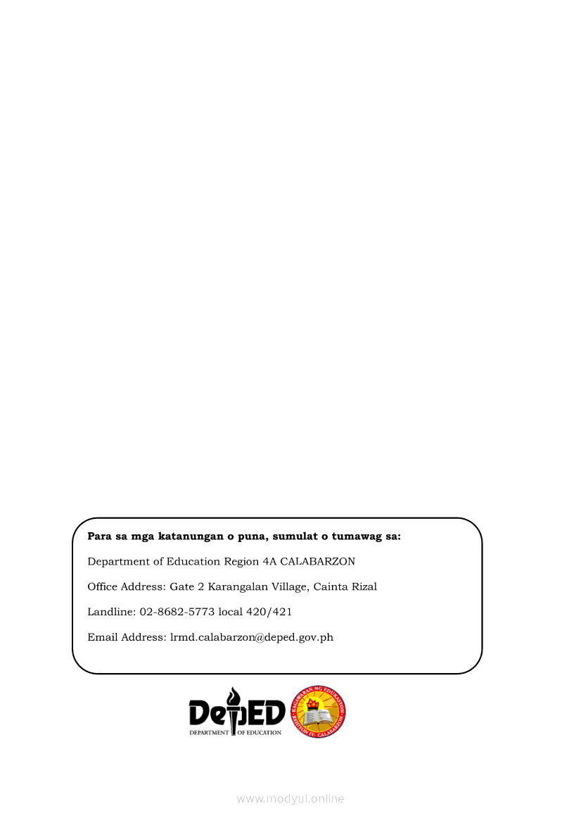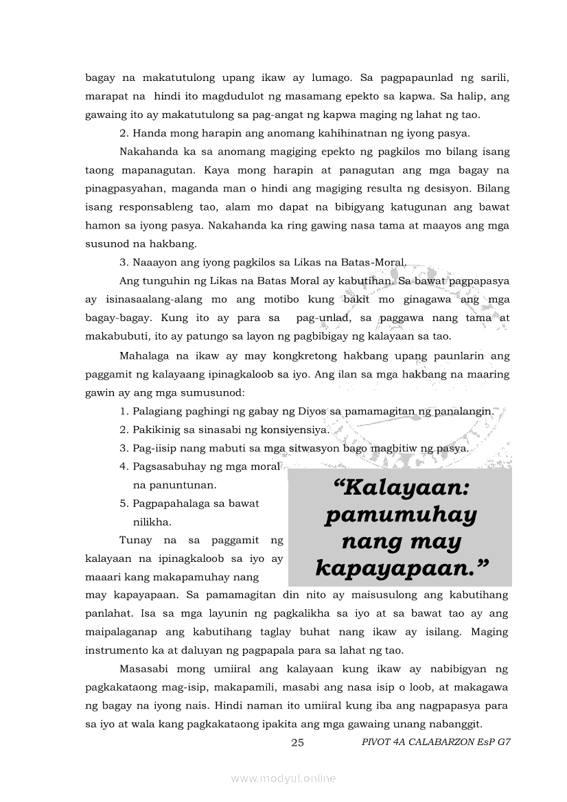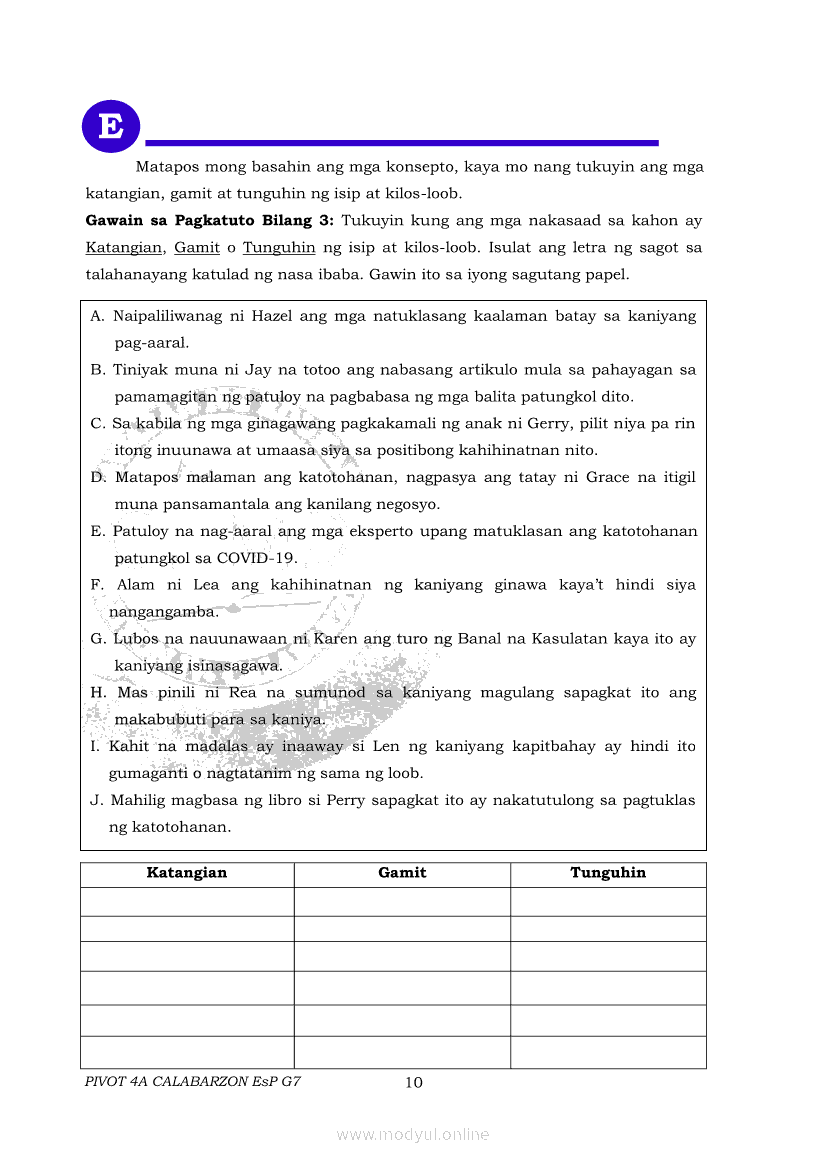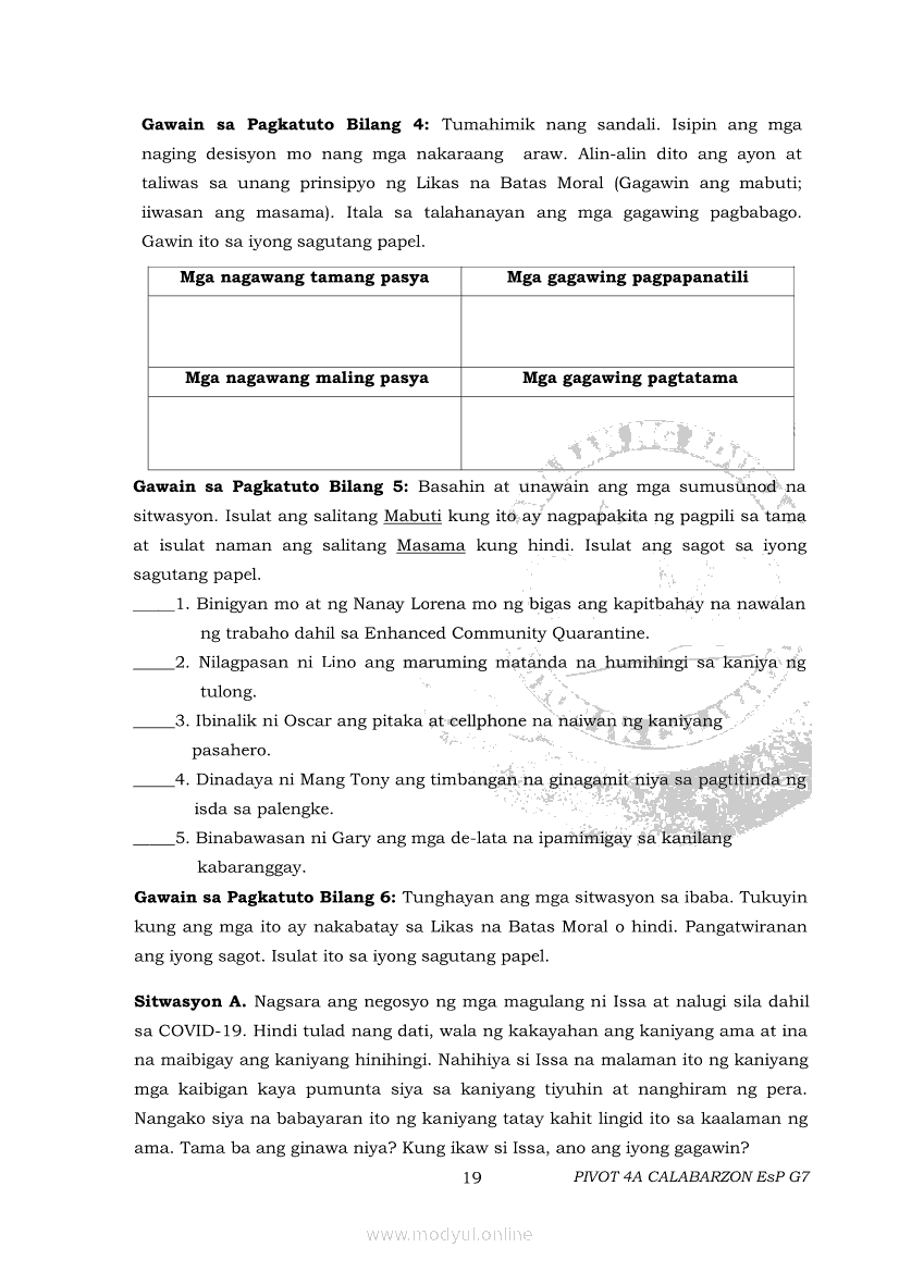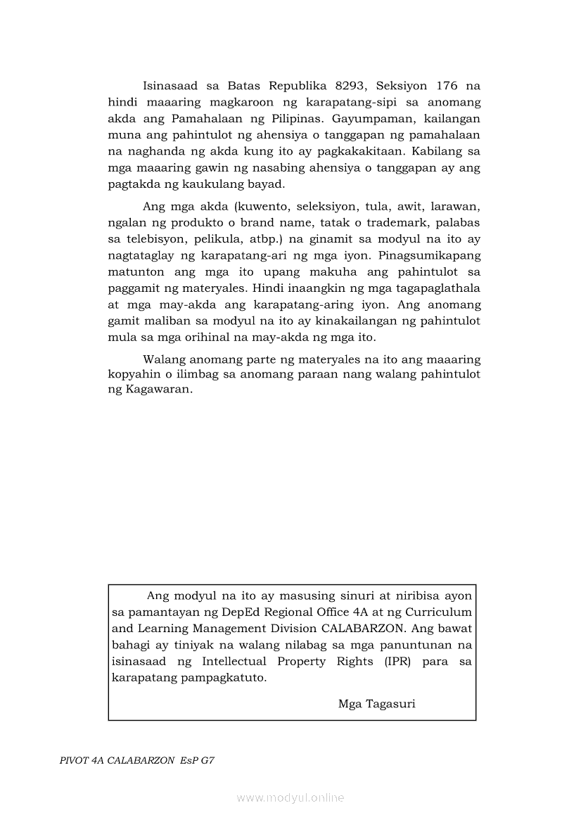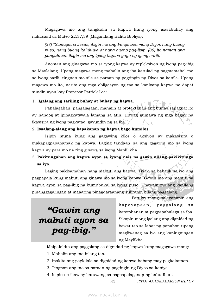Edukasyon sa Pagpapakatao 7 Modyul para sa Ikalawang Markahan (PIVOT)Apr 22, 2021 Grade 7Xiaomi Redmi Watch 5 Active 2inch LCD Display Clear Calling 5ATM Waterproof Smart Watch for only ₱3,999 ₱1,200!. Edukasyon sa Pagpapakatao 7RelatedEdukasyon sa Pagpapakatao Ikaapat Markahan – Modyul: 12.b Ang Pahayag ng Personal na Layunin sa Buhay o Personal Mission Statement (Linggo:Ikalawa)Edukasyon sa Pagpapakatao Ikaapat na Markahan – Modyul 12.a: Ang Kahalagahan ng Mabuting Pagpapasya sa Uri ng Buhay (Linggo: Una)Edukasyon sa Pagpapakatao 7 Modyul 1: Ako NgayonEdukasyon sa Pagpapakatao 7 Modyul 8: Pag-unlad ng Hilig Paglawak ng TungkulinEdukasyon sa Pagpapakatao 7 Modyul 4: Talento Mo, Ating Tuklasin