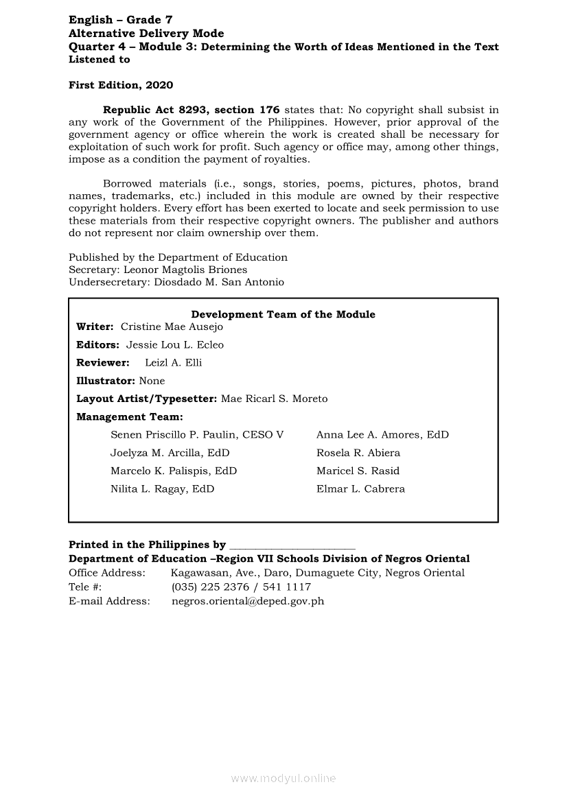 English Quarter 4 – Module 3: Determining the Worth of Ideas Mentioned in Text Listened toMay 27, 2021 Grade 7Xiaomi Redmi Watch 5 Active 2inch LCD Display Clear Calling 5ATM Waterproof Smart Watch for only ₱3,999 ₱1,200!. English 7 4th QuarterRelatedENGLISH Quarter 4-Module 5 Types of Literary Conflicts and their Non-Violent SolutionsEnglish Quarter 4 – Module 6: Literature as a Tool to Assert One’s Unique Identity and to Better Understand Other PeopleEnglish Quarter 4 – Module 7: Compose an Informative EssayAraling Panlipunan Ikaapat na Markahan – Modyul 7: Neokolonyalismo sa Silangan at Timog-Silangang AsyaAraling Panlipunan Ikaapat na Markahan – Modyul 8: Ang mga Kontribusyon ng Silangan at Timog- Silangang Asya sa Larangan ng Kultura