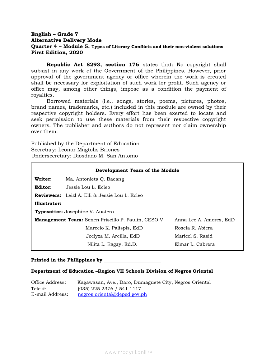 ENGLISH Quarter 4-Module 5 Types of Literary Conflicts and their Non-Violent SolutionsMay 27, 2021 Grade 7Xiaomi Redmi Watch 5 Active 2inch LCD Display Clear Calling 5ATM Waterproof Smart Watch for only ₱3,999 ₱1,200!. English 7 4th QuarterRelatedEnglish Quarter 4 – Module 6: Literature as a Tool to Assert One’s Unique Identity and to Better Understand Other PeopleEnglish Quarter 4 – Module 3: Determining the Worth of Ideas Mentioned in Text Listened toEnglish Quarter 4 – Module 7: Compose an Informative EssayECLIPSES for Science Grade 7 Quarter 4 / Week 6Filipino 7 Ikaapat na Markahan Modyul 7 IBONG ADARNA: Ang Higit Pangpagsubok na Kinaharap ni Don Juan sa Reyno de los Cristales