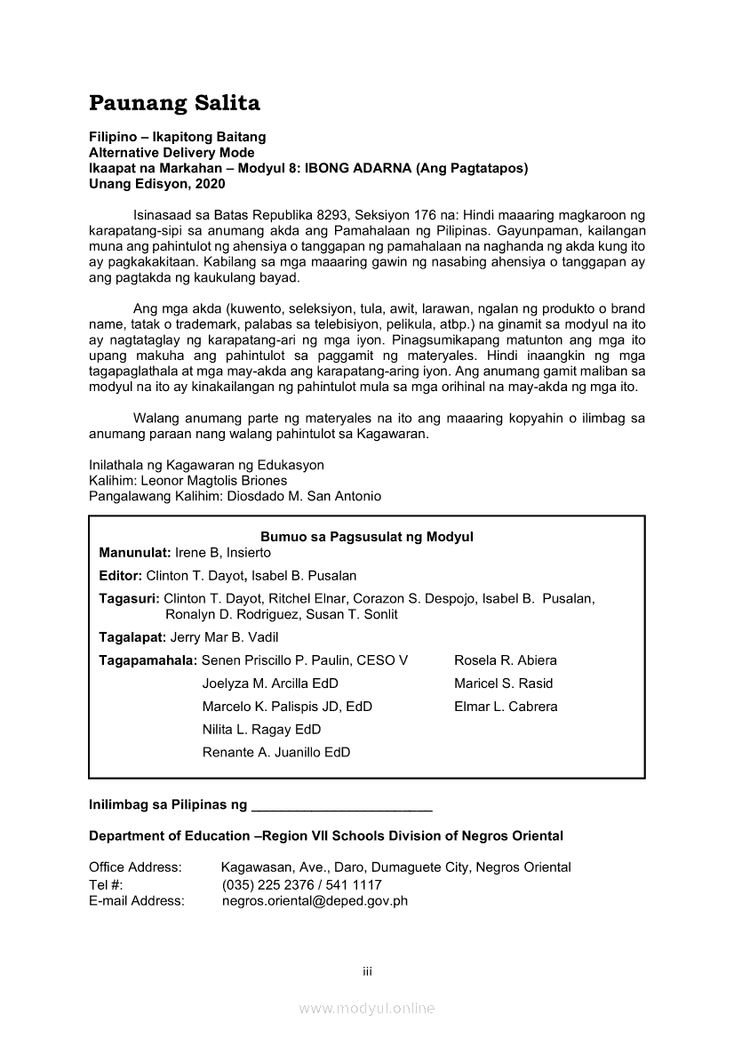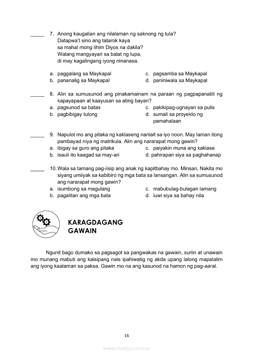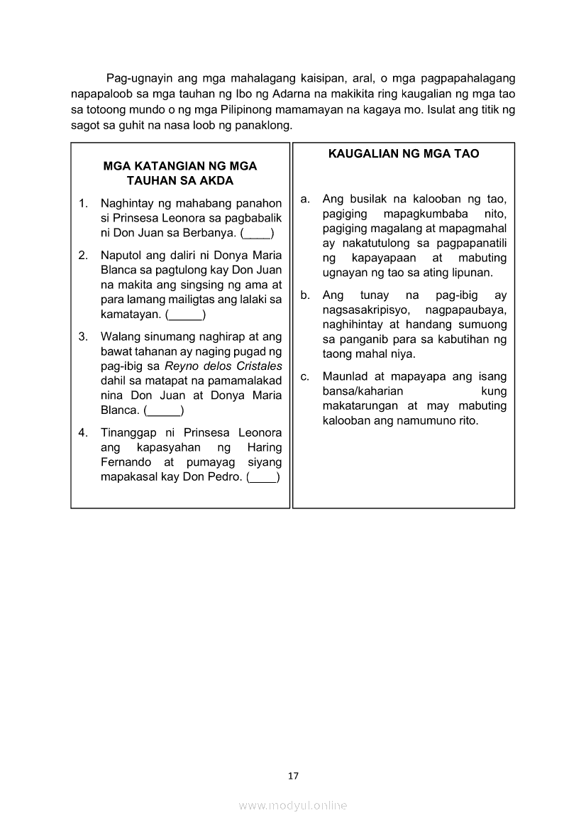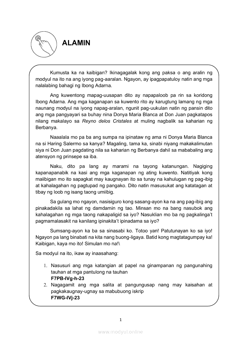 Filipino 7 Ikaapat na Markahan Modyul 8 IBONG ADARNA (Ang Pagtatapos)May 27, 2021 Grade 7Xiaomi Redmi Watch 5 Active 2inch LCD Display Clear Calling 5ATM Waterproof Smart Watch for only ₱3,999 ₱1,200!. Filipino 7 4th QuarterRelatedFilipino 7 Ikaapat na Markahan – Modyul 4 Ibong Adarna: Pag-awit ng Ibong Adarna (Saknong 330 – 570)Filipino 7 Ikaapat na Markahan – Modyul 1 KALIGIRANG KASAYSAYAN NG IBONG ADARNAFilipino 7 Ikaapat na Markahan Modyul 7 IBONG ADARNA: Ang Higit Pangpagsubok na Kinaharap ni Don Juan sa Reyno de los CristalesFilipino 7 Ikaapat na Markahan Modyul 6 IBONG ADARNA: Maghintay, Magpakailanman hanggang sa Ang Ikalawang PagsubokFilipino 7 Ikaapat na Markahan – Modyul 5 IBONG ADARNA: SAKNONG 567-831