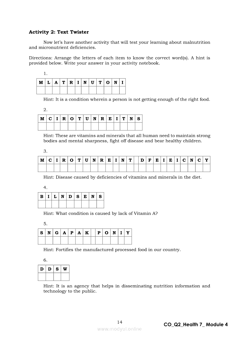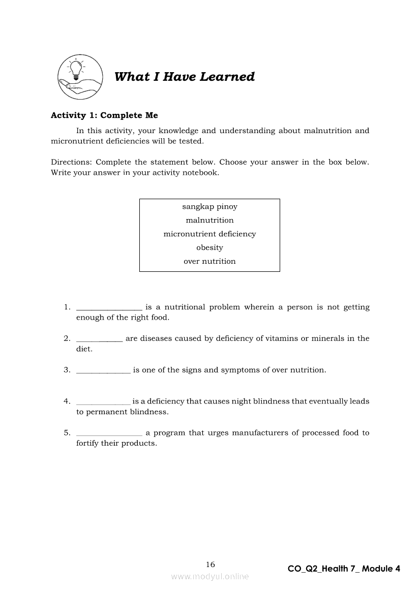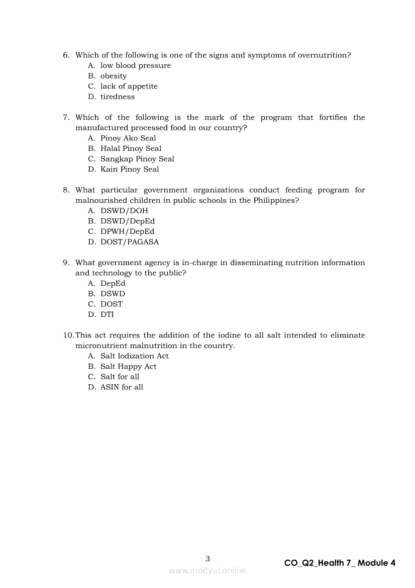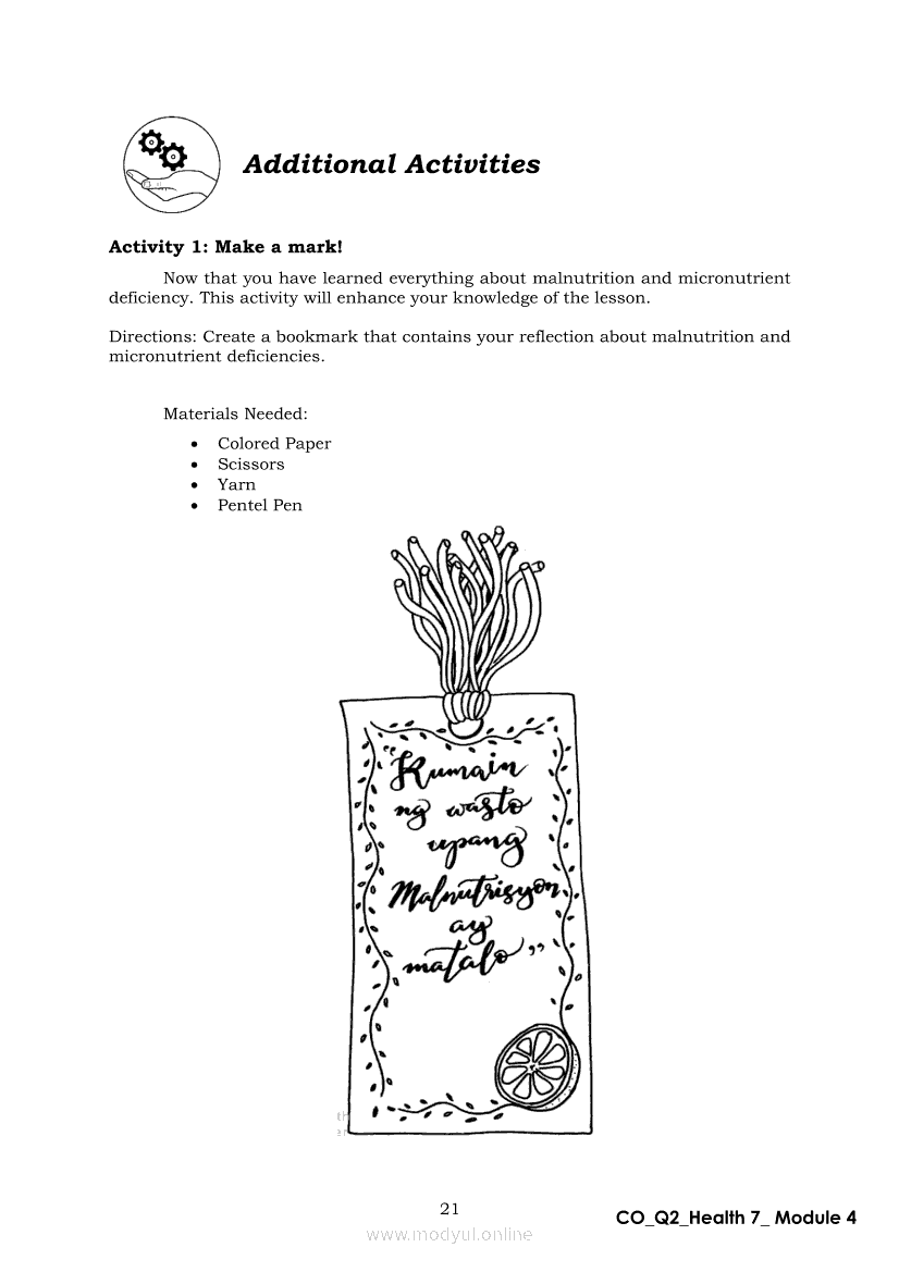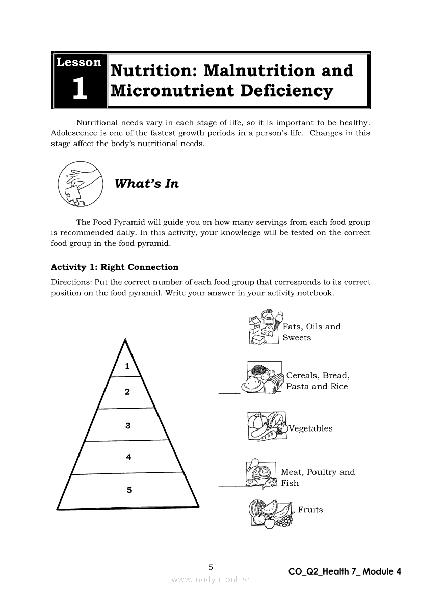 Health 7 Quarter 2 – Module 4: Malnutrition and Micronutrient DeficiencyApr 22, 2021 Grade 7Xiaomi Redmi Watch 5 Active 2inch LCD Display Clear Calling 5ATM Waterproof Smart Watch for only ₱3,999 ₱1,200!. Health 7RelatedHEALTH Quarter 4 – Module: 4a Nature of Non-Communicable Diseases (NCDs)HEALTH Quarter 4 – Module: 4b Ways to Prevent and Control Non-Communicable DiseasesHealth 7 Quarter 2 – Module 6: Applying Decision-Making Skills to Prevent Nutritional ProblemsHealth 7 Module 5: Health ServicesHealth 7 Quarter 2 – Module 2: Nutritional Guidelines