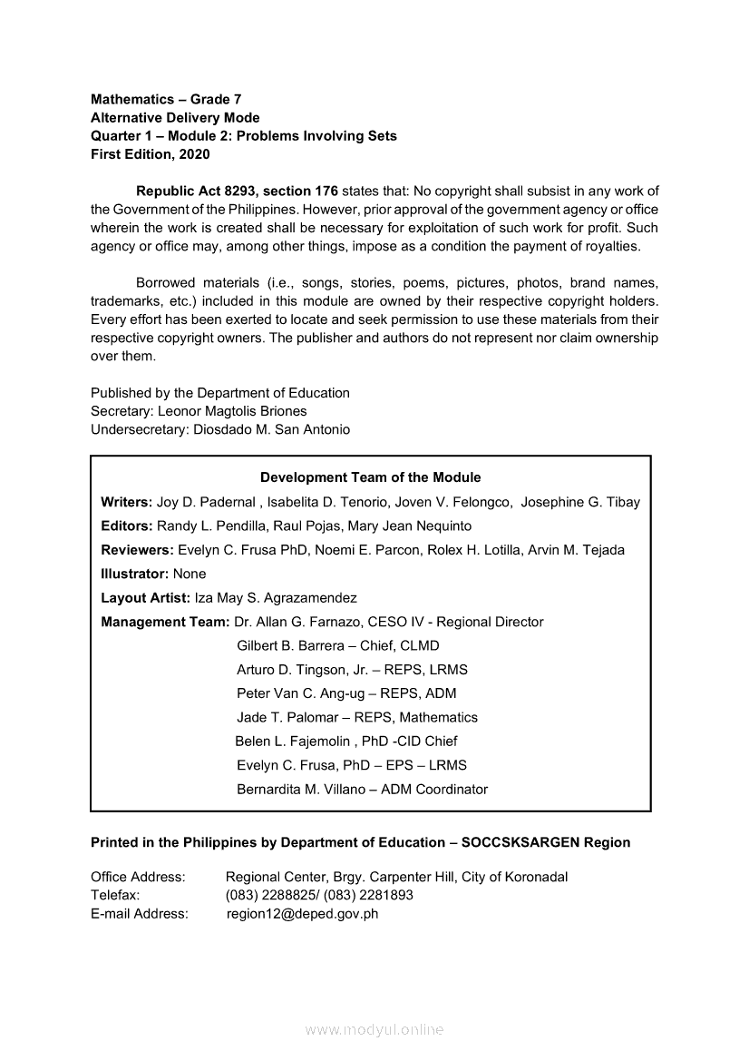 Math 7 Module 2: Problems Involving SetsApr 22, 2021 Grade 7Xiaomi Redmi Watch 5 Active 2inch LCD Display Clear Calling 5ATM Waterproof Smart Watch for only ₱3,999 ₱1,200!. Math 7RelatedMATHEMATICS Quarter 4 – Module 5 Measures of Central TendencyMATHEMATICS Quarter 4 – Module 4 Graphs to Represent Organized DataMATHEMATICS Quarter 4 – Module 1 Problem Solving Involving StatisticsMATHEMATICS Quarter 4 – Module 7 Statistical Data InterpretationMATHEMATICS Quarter 4 – Module 6 Measures of Variability