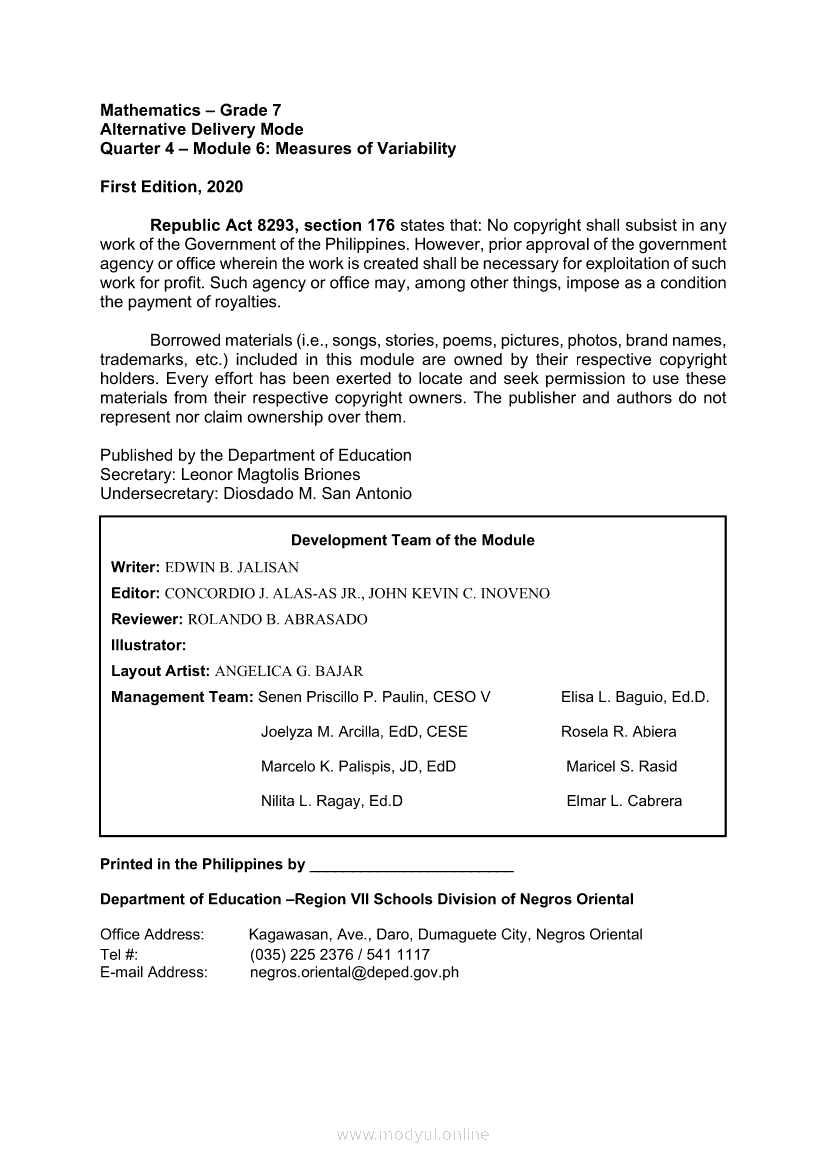 MATHEMATICS Quarter 4 – Module 6 Measures of VariabilityMay 27, 2021 Grade 7Xiaomi Redmi Watch 5 Active 2inch LCD Display Clear Calling 5ATM Waterproof Smart Watch for only ₱3,999 ₱1,200!. Math 7 4th QuarterRelatedMATHEMATICS Quarter 4 – Module 5 Measures of Central TendencyMATHEMATICS Quarter 4 – Module 7 Statistical Data InterpretationMATHEMATICS Quarter 4 – Module 1 Problem Solving Involving StatisticsMATHEMATICS Quarter 4 – Module 4 Graphs to Represent Organized DataMATHEMATICS Quarter 4 – Module 3 Frequency Distribution