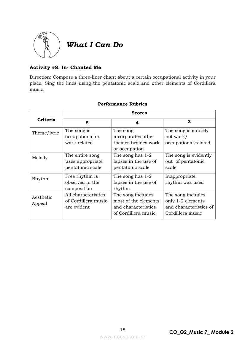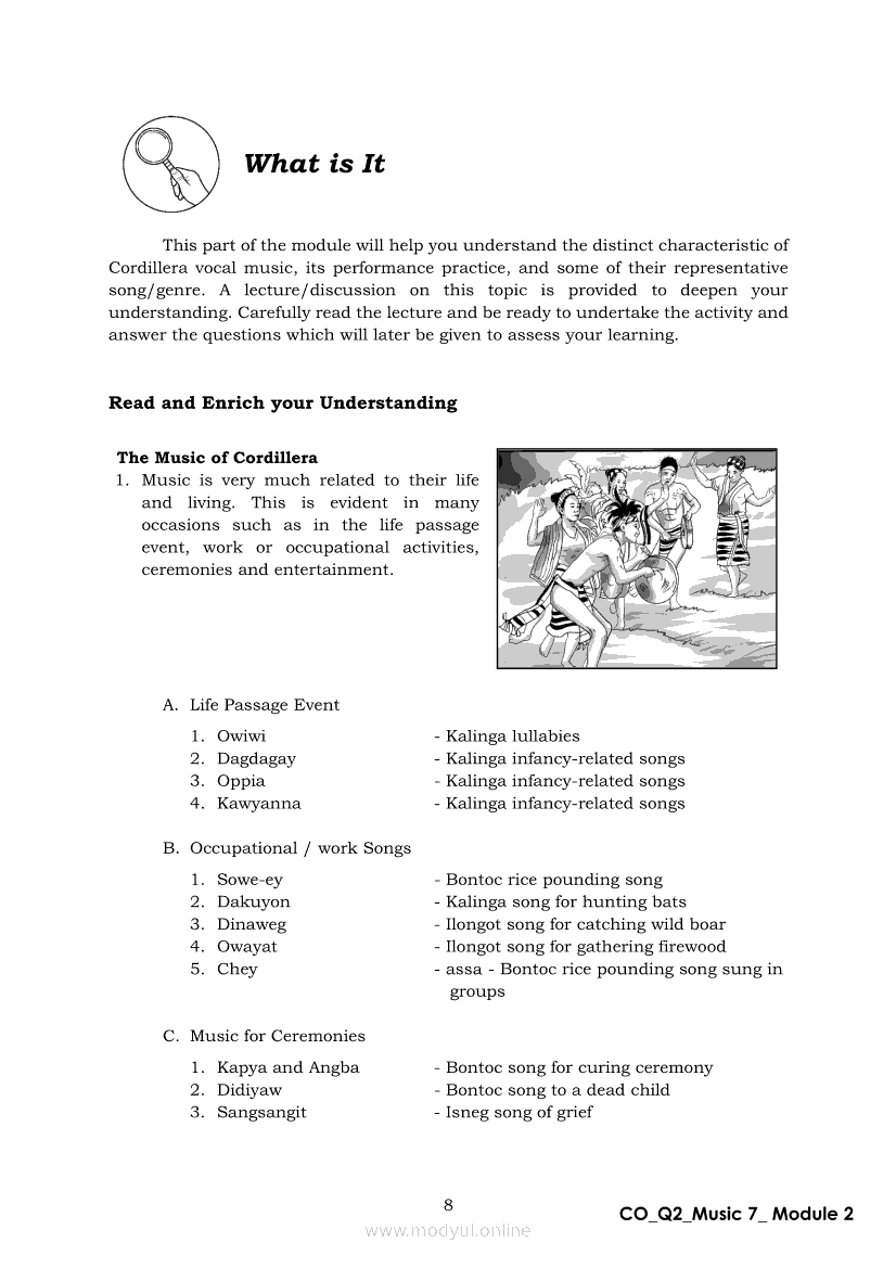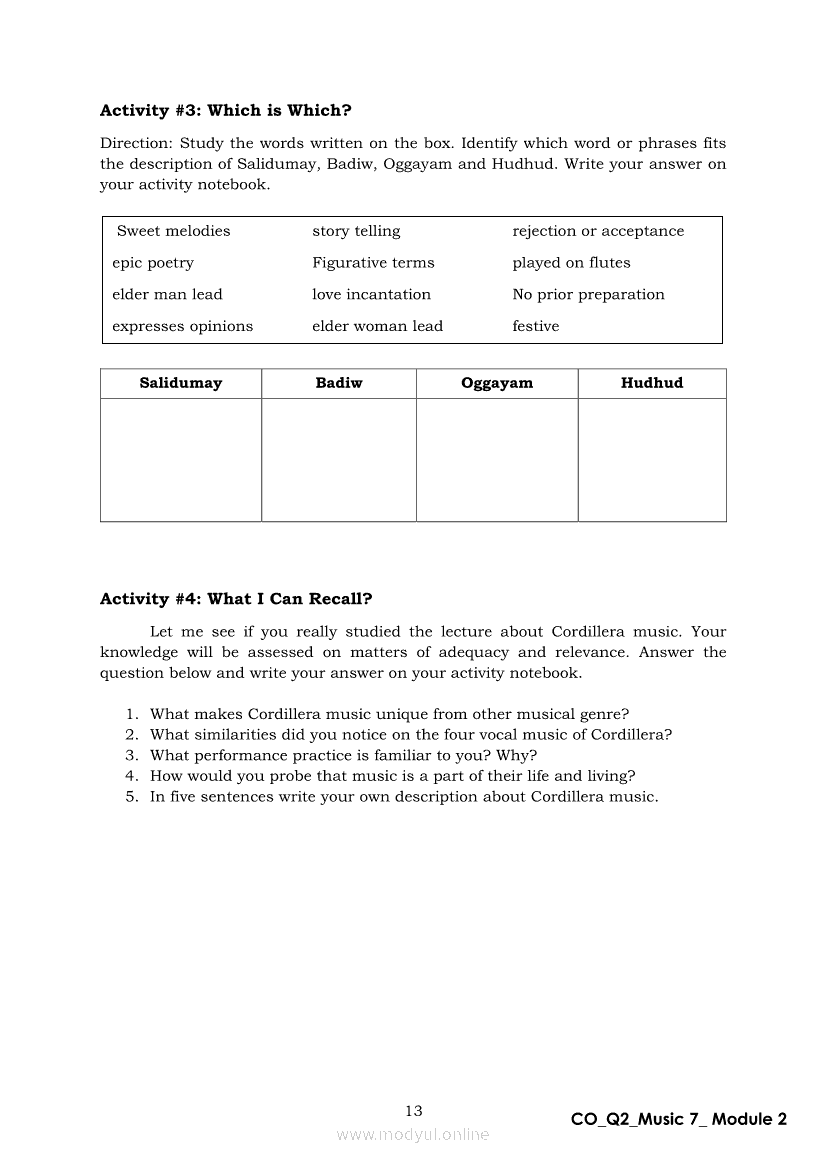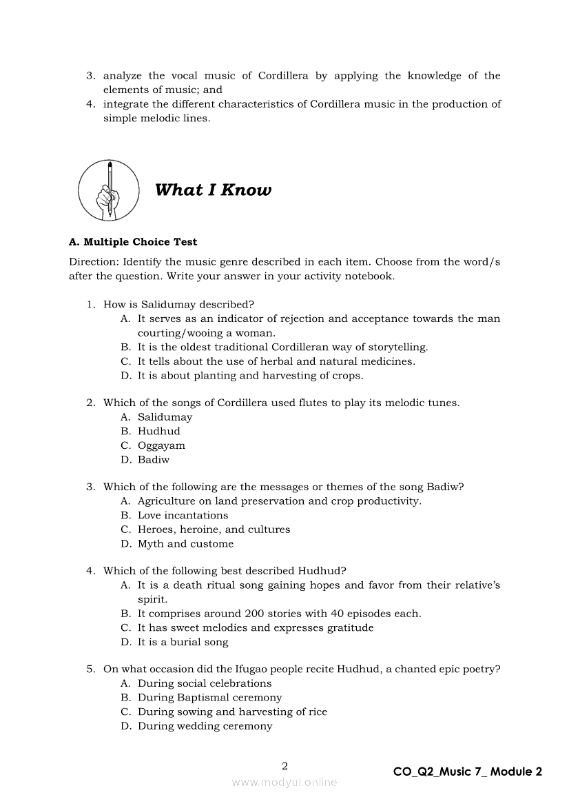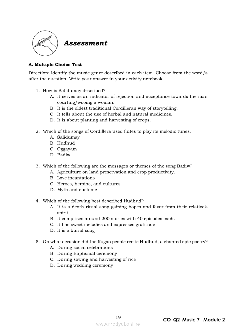 Music 7 Quarter 2 – Module 2: Vocal Music of CordilleraApr 22, 2021 Grade 7Xiaomi Redmi Watch 5 Active 2inch LCD Display Clear Calling 5ATM Waterproof Smart Watch for only ₱3,999 ₱1,200!. Music 7RelatedMUSIC Quarter 4 – Module 4a Music of Philippine Festivals and Theatrical Forms IMUSIC Quarter 4 – Module 4b Music of Philippine Festivals and Theatrical Forms IIMusic 7 Quarter 2 – Module 1: Music of the Indigenous People of Luzon and Visayas Music of Cordillera, Palawan, Mindoro, and the VisayasMusic 7 Quarter 2 – Module 3: Instrumental Music of CordilleraMusic 7 Module 4: Music of Lowlands of Luzon Devotional Music and Brass Band