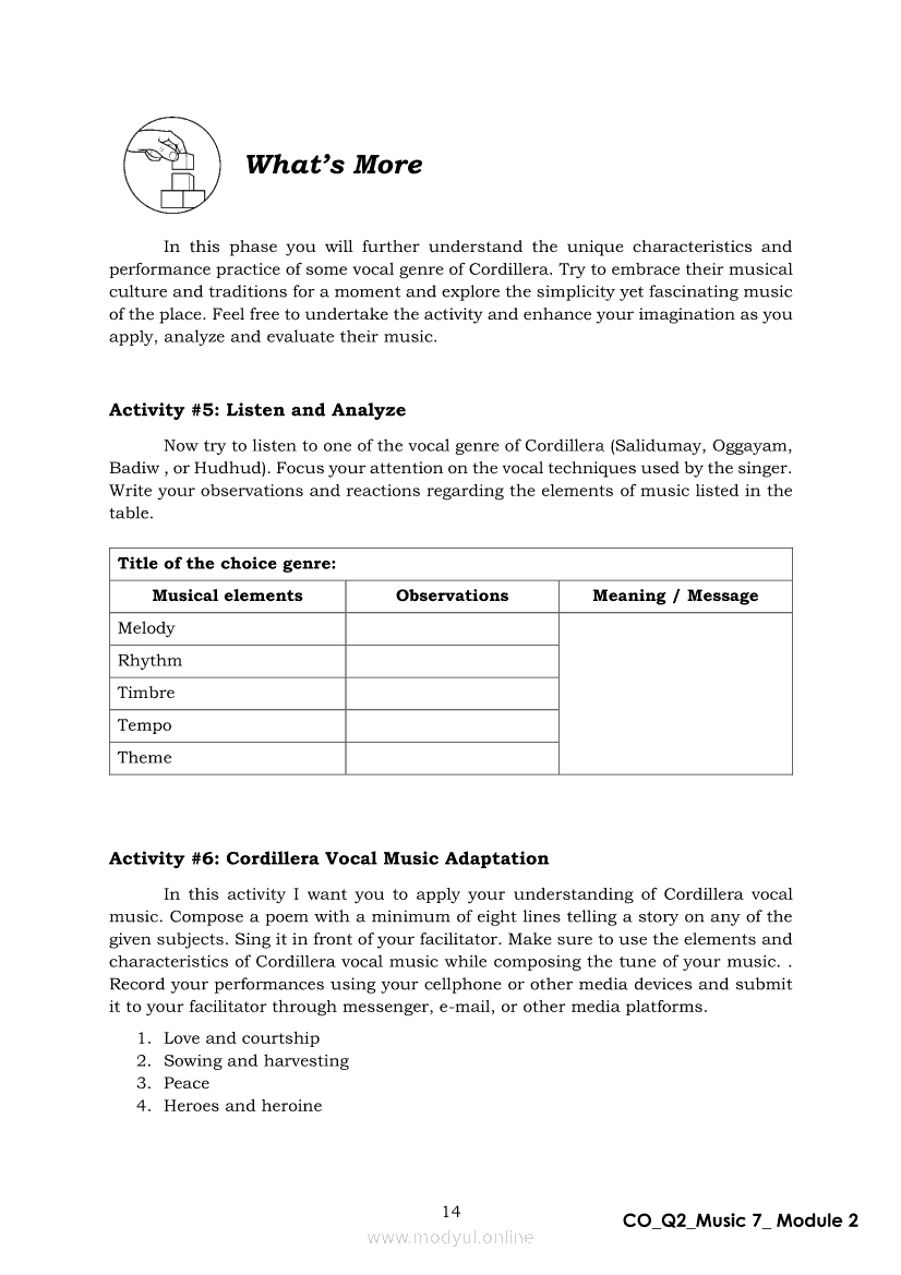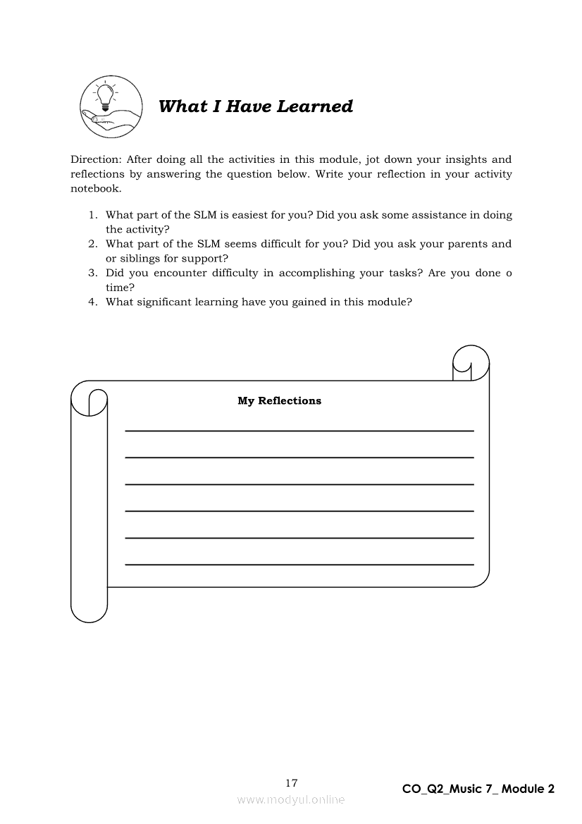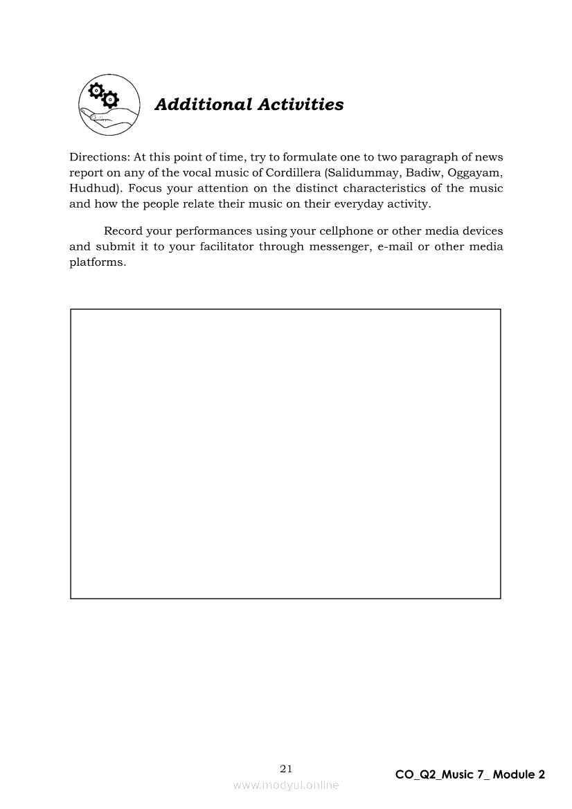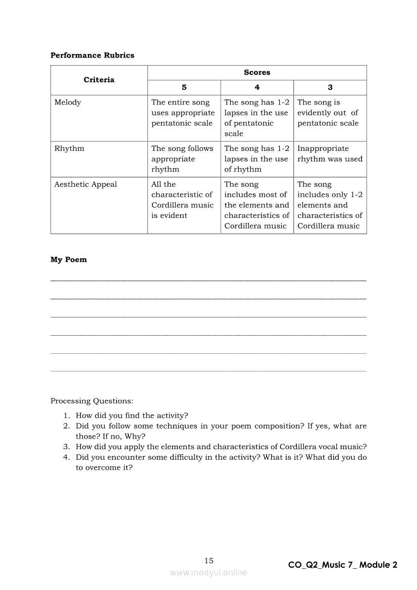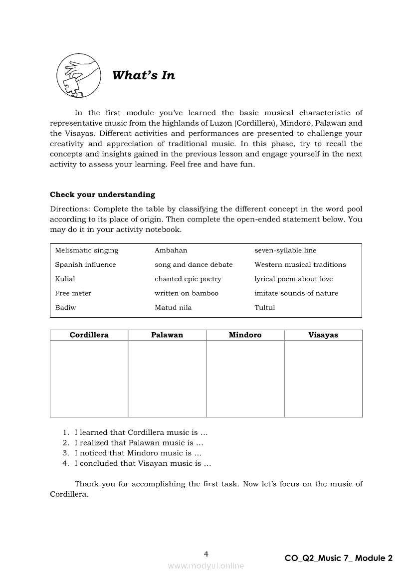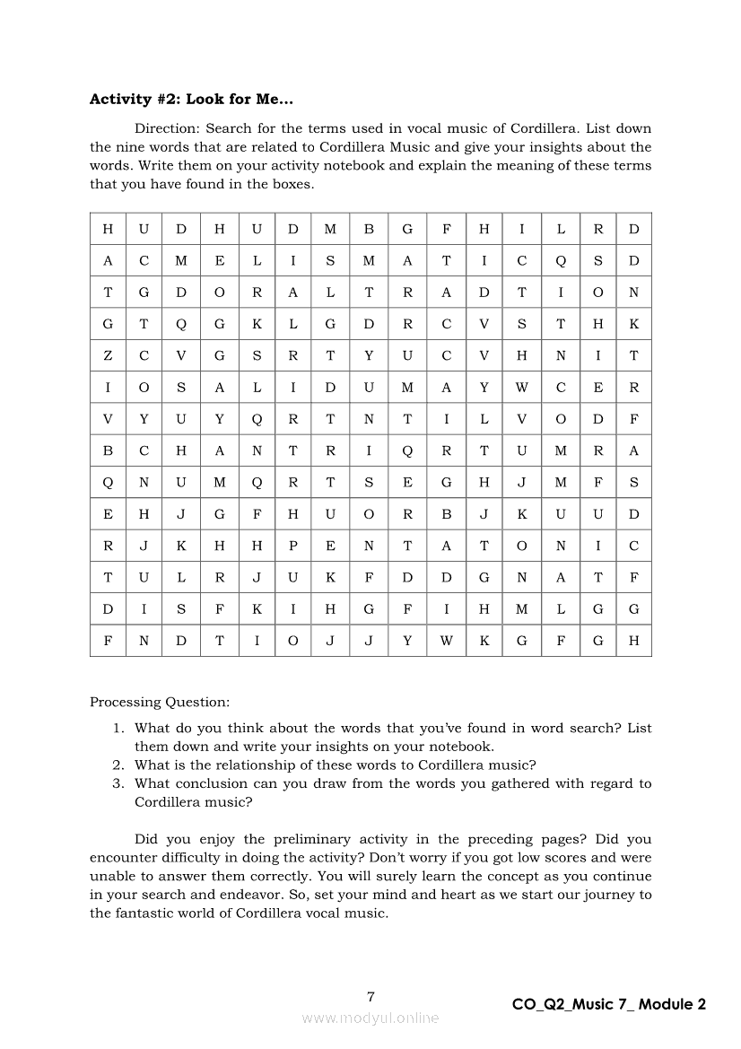 Music 7 Quarter 2 – Module 2: Vocal Music of CordilleraApr 22, 2021 Grade 7Xiaomi Redmi Watch 5 Active 2inch LCD Display Clear Calling 5ATM Waterproof Smart Watch for only ₱3,999 ₱1,200!. Music 7RelatedMUSIC Quarter 4 – Module 4a Music of Philippine Festivals and Theatrical Forms IMUSIC Quarter 4 – Module 4b Music of Philippine Festivals and Theatrical Forms IIMusic 7 Quarter 2 – Module 1: Music of the Indigenous People of Luzon and Visayas Music of Cordillera, Palawan, Mindoro, and the VisayasMusic 7 Quarter 2 – Module 3: Instrumental Music of CordilleraMusic 7 Module 4: Music of Lowlands of Luzon Devotional Music and Brass Band